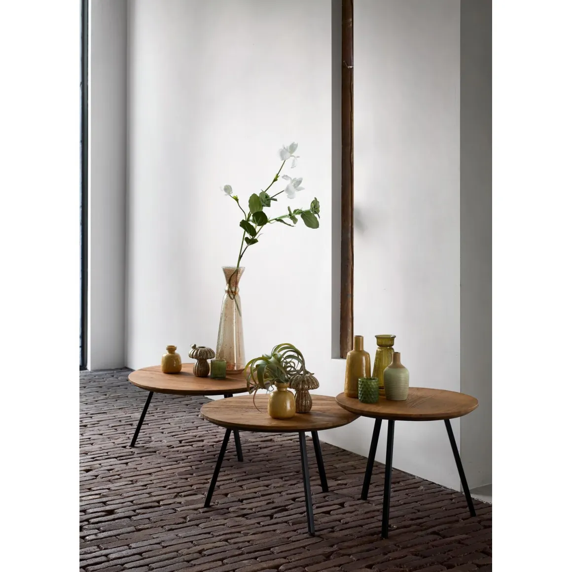 | Uitvoering | Uitgevoerd met een rond blad (3 cm dik) in teakhout mix rough met een afgeschuinde bladrand en metalen poten 2×2 cm. |