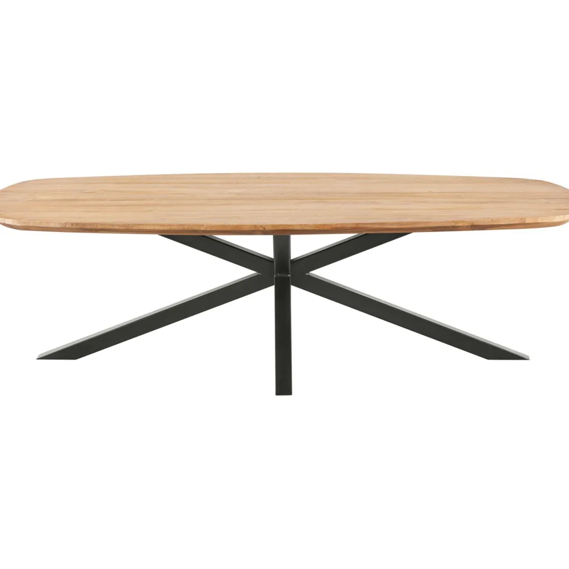 | Uitvoering | Uitgevoerd met een Deens ovaal blad (3 cm dik) in teakhout mix rough met een afgeschuinde bladrand en een metalen spinpoot 4×4 cm. |