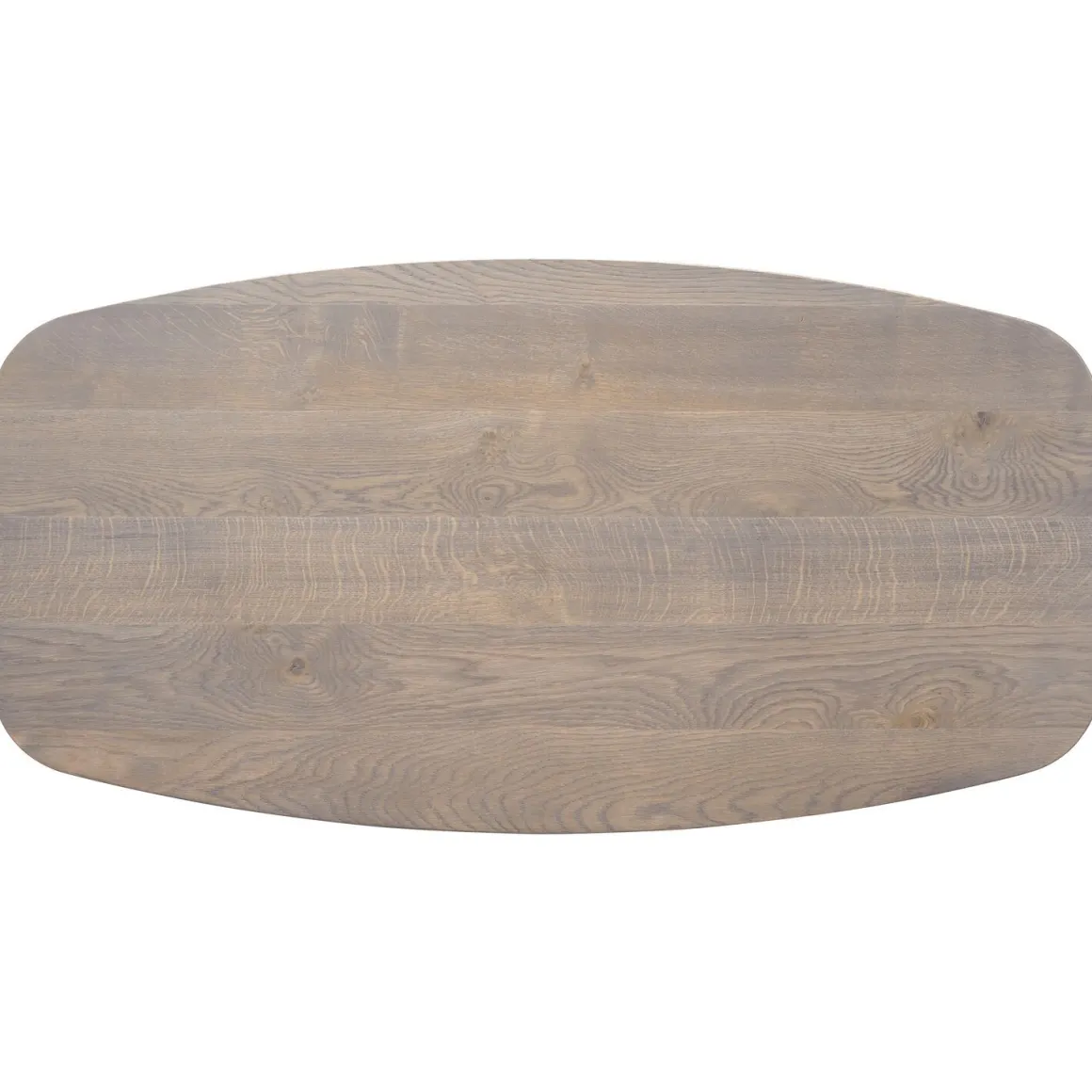Deze prachtige salontafel uit onze tafelserie Tavolo heeft een eigentijds afgeschuind tafelblad in een Deens ovale vorm, vervaardigd uit hoogwaardig massief geborsteld eikenhout. Het blad is afgewerkt met een luxe NC-lak in een stijlvolle grijsbruine tint. Het zwart metalen onderstel bestaat uit twee ongelijk geplaatste U-poten, die eenvoudig zelf gemonteerd kunnen worden en zorgen voor een optimale stabiliteit.