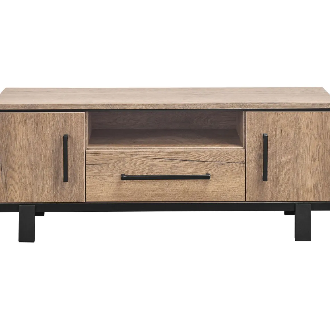Het Adanti tv-meubel is een trendy kast met een industriële uitstraling. De warme, lichtbruine kleur en het gepoedercoate zwart metalen frame zorgen voor een unieke sfeer in je woonkamer. Deze robuuste kast is afgewerkt met een melamine toplaag. De toplaag ziet eruit als echt hout en heeft zelfs een licht reliëf, waardoor het ook aanvoelt als echt hout. Het materiaal is kras-, slijt- en stootvast, eenvoudig in onderhoud en gebruiksvriendelijk. Hierdoor is het tv-meubel ook bijzonder geschikt voor gezinnen met (jonge) kinderen.