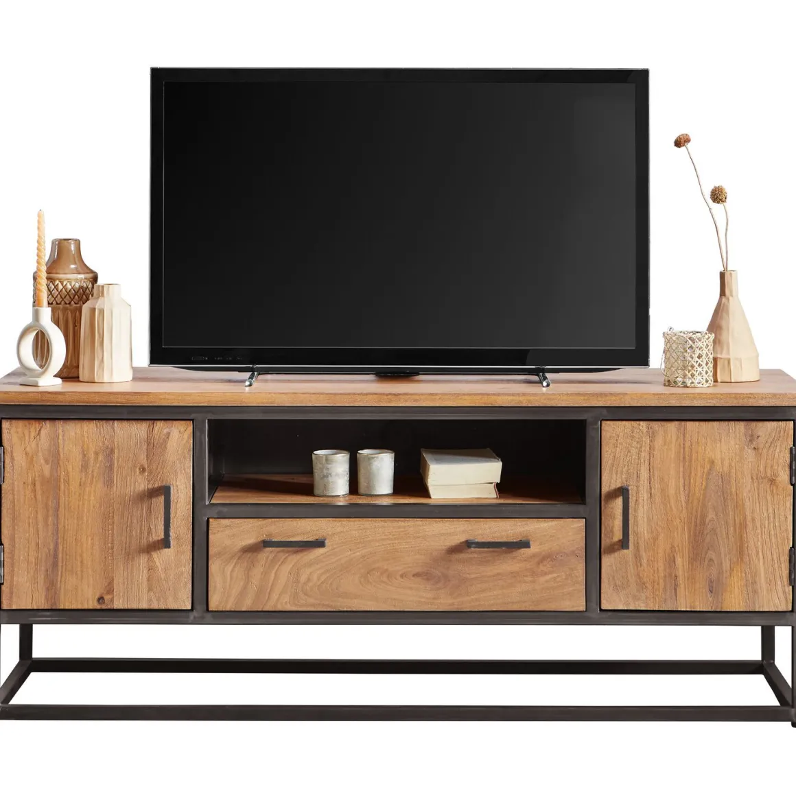 Tv-meubel Mesola is een trendy kast met een industriële uitstraling. De warme, lichtbruine kleur en het metalen frame zorgen voor een unieke sfeer in je woonkamer. Deze robuuste kast is gemaakt van massief mangohout. Dit hout heeft een natuurlijke uitstraling met verschillende lijnen, nerven en kleurschakeringen. Hierdoor is ieder meubel uniek. Het hout is afgewerkt met een transparante lak, zodat er niet snel vlekken op ontstaan en het onderhoud eenvoudig is.