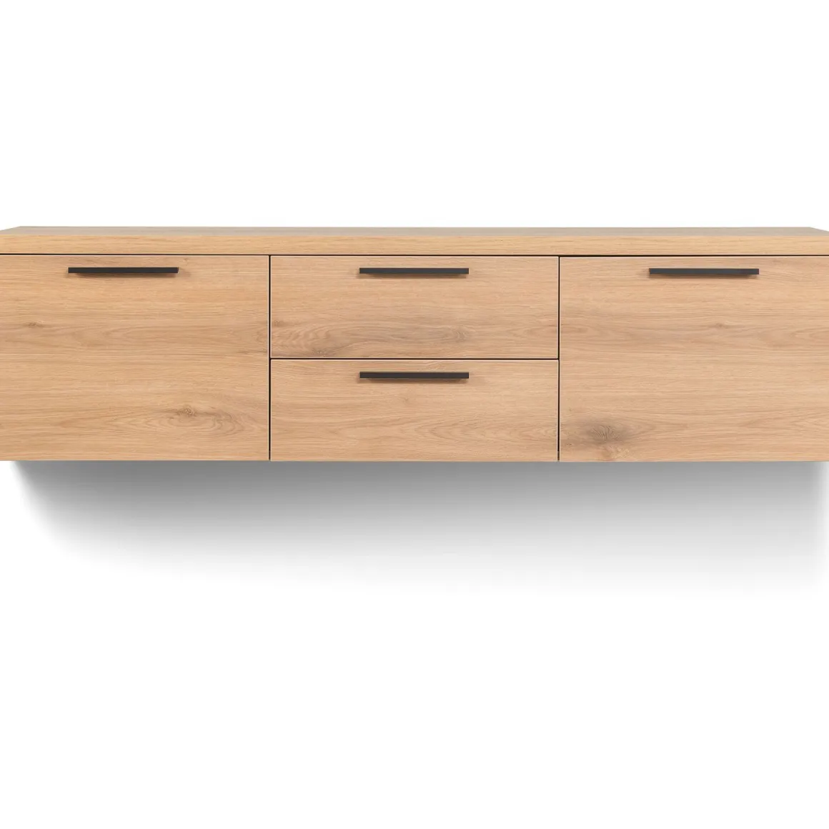Dit tv-meubel kan zowel hangend als staand geplaatst worden. Plaats je het meubel op pootjes, dan is de hoogte 43 cm. Hang je het meubel op, dan is de ideale hoogte 57 cm. Met een breedte van 165 cm en een diepte van 42 cm is dit tv-meubel voorzien van twee deuren en twee laden. Alle deuren en laden zijn voorzien van softclose, waardoor ze soepel en geruisloos sluiten. In het open vak plaats je eenvoudig je apparatuur, terwijl in de laden ruimte is om mediatoebehoren of accessoires netjes uit het zicht te bewaren. Achter de deuren bevindt zich een legplank voor extra opbergruimte. Aan de achterzijde bevindt zich een opening om kabels netjes weg te werken. Het meubel wordt grotendeels gemonteerd geleverd; alleen een kleine montage, zoals het bevestigen van de handgrepen, is nog nodig.