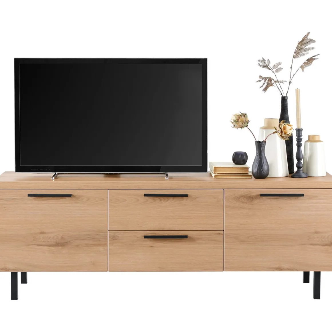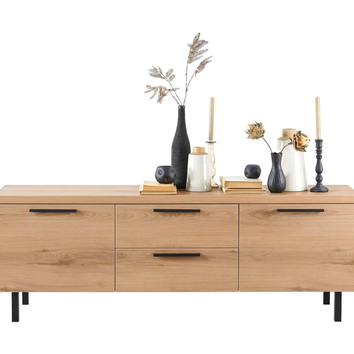 | Uitvoering | Uitgevoerd in melamine Natural Canella Oak decor met zwart metalen handgrepen en poten met 2 deuren en 2 laden. |