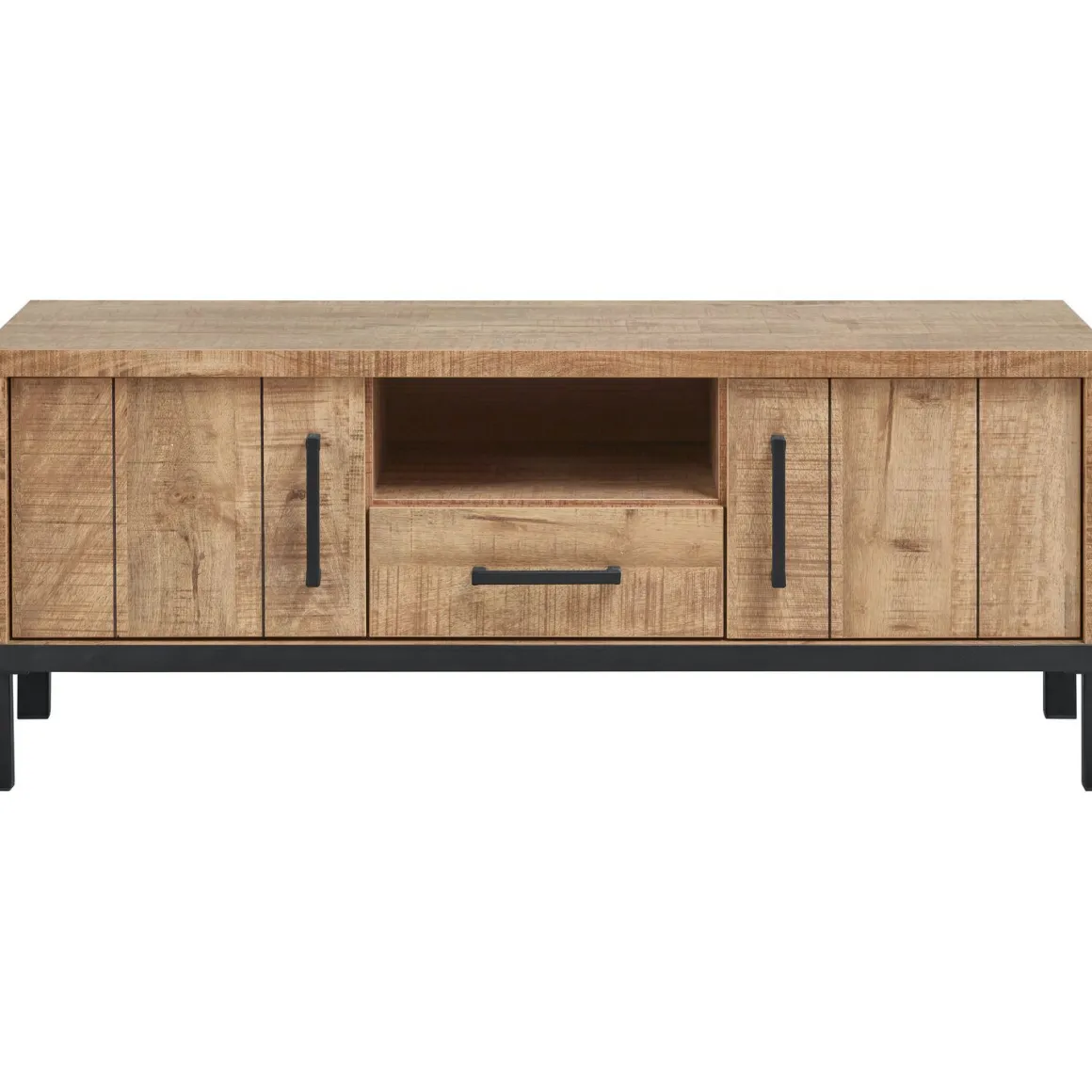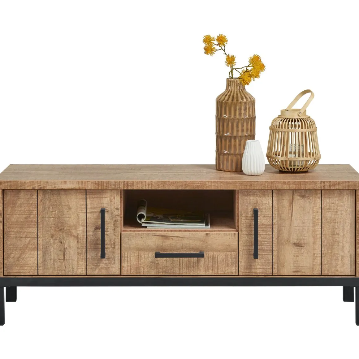 | Uitvoering | Uitgevoerd in melamine met mango decor in combinatie met zwart metalen frame, met 2 deuren, 1 lade en 1 open vak. |