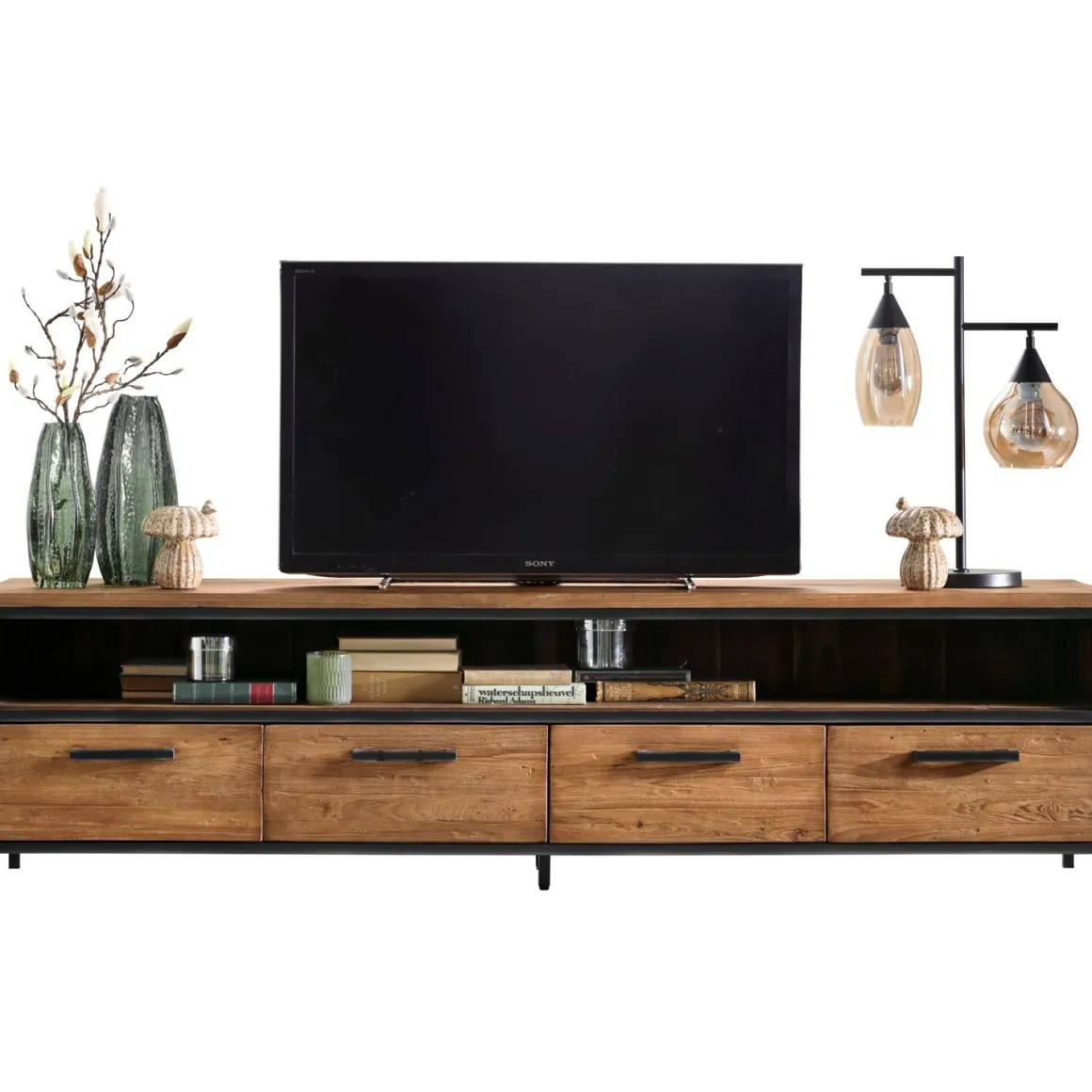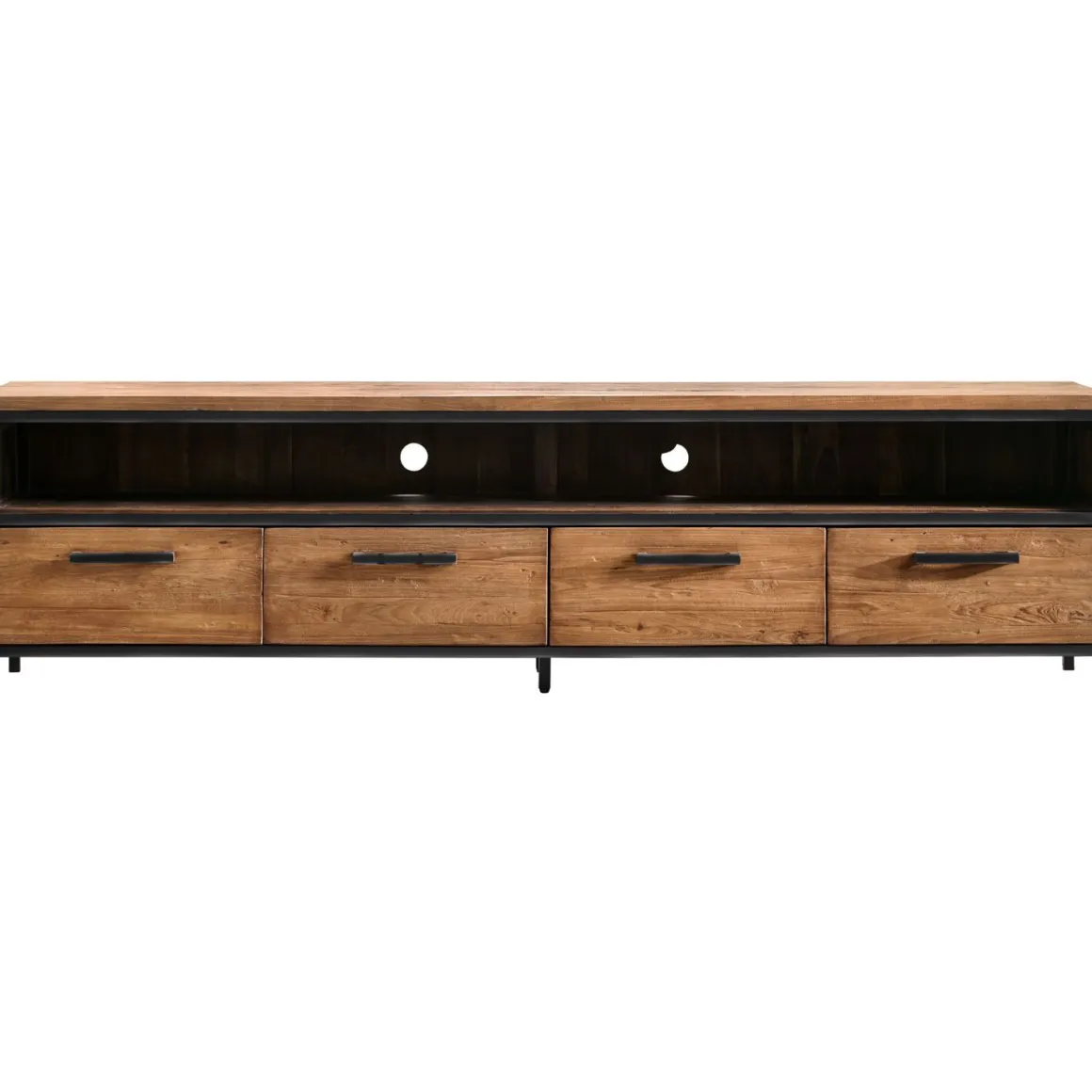 TV-meubel Romaro heeft een stoere en robuuste uitstraling en is gemaakt van Mix Rough Teak dat is geborsteld, zodat het een ruw oppervlak heeft. Het hout is afgewerkt met een hoogwaardige matte NC-lak. De combinatie van het grof gelaste stalen frame en het geborsteld teakhout geeft het meubel dit stoere en robuuste karakter. De kast is 200 cm breed en 54 cm hoog en heeft 4 laden en 1 open vak, en biedt daardoor flink wat opbergruimte. Het open vak is 16 cm hoog, 195 cm breed en heeft een diepte van 40 cm.