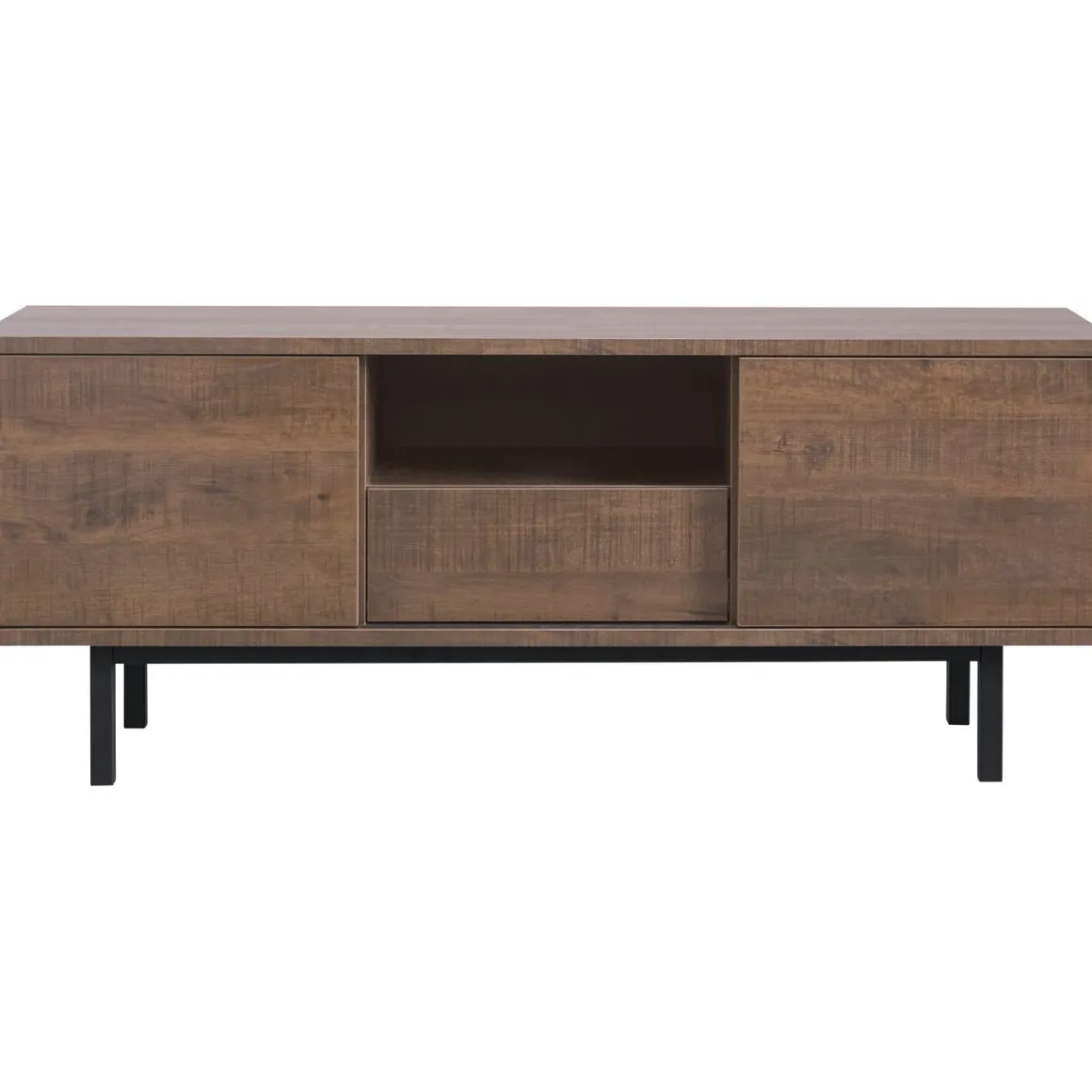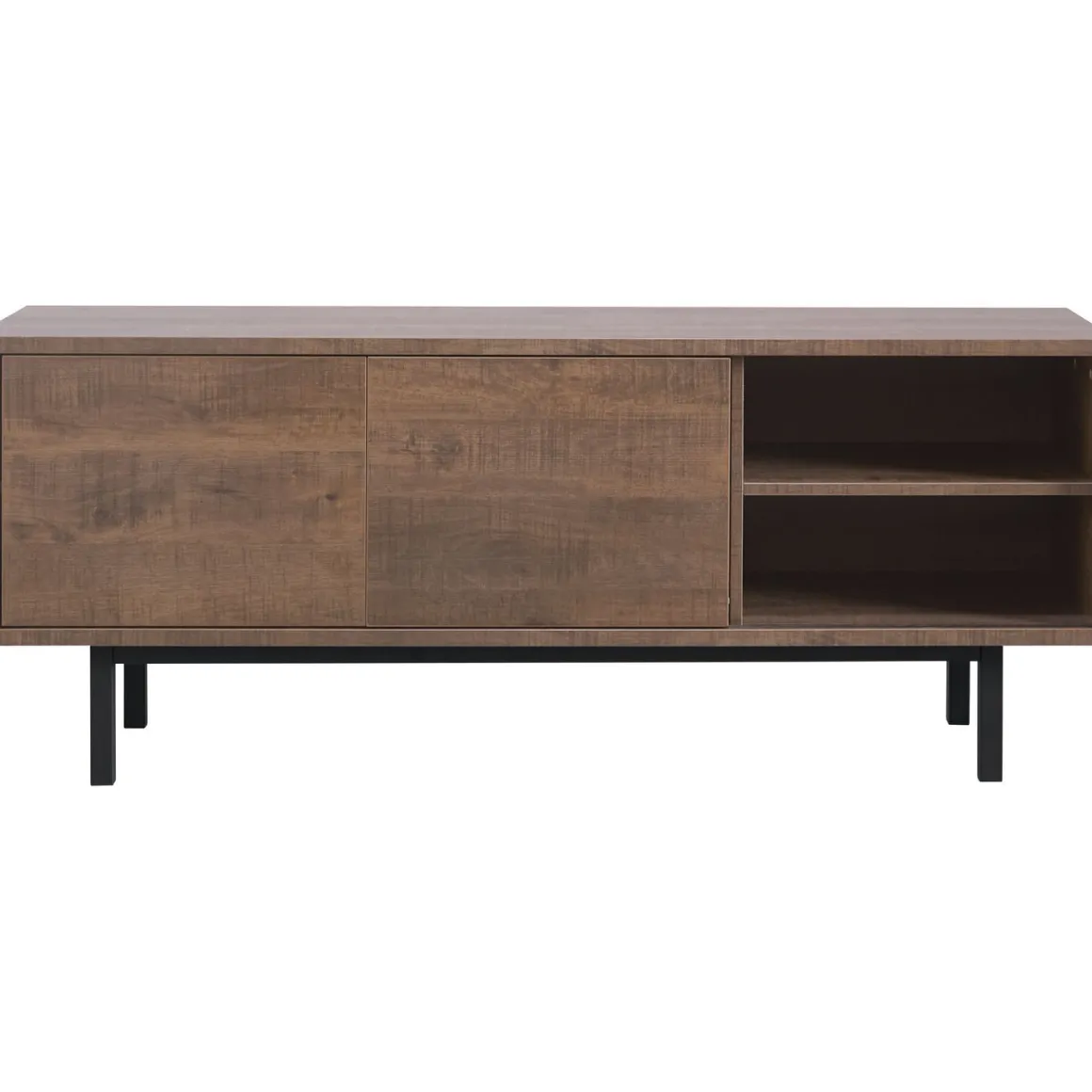 | Uitvoering | Uitgevoerd in melamine met dark mango decor in combinatie met zwart metalen poten met 2 schuifdeuren, 1 lade en 1 open vak. |