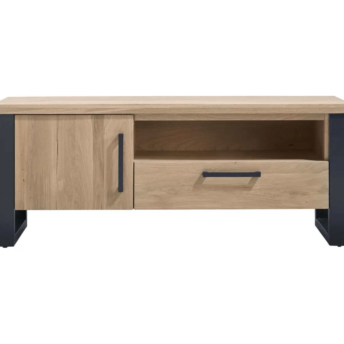 Dit industriële tv-meubel Verato is gemaakt van eikenhout met een metalen frame. Eikenhout kenmerkt zich door de fijne nerf, vlamtekening en de wisselende kleurschakering. Elke boom heeft een eigen uitstraling door de groei en weersinvloeden. Structuur, nerfschakering, windbarstjes, haarscheurtjes en de aanwezigheid van grote en kleine knoesten getuigen van jarenlange groei en maken het hout van de boom authentiek.