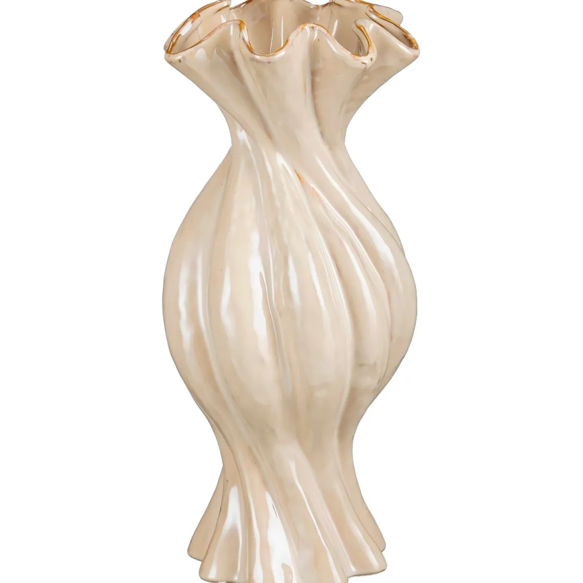 Deze cremekleurige vaas geeft je interieur een rustige en verfijnde touch. De zachte, neutrale kleur maakt hem gemakkelijk te combineren met andere accessoires en woonstijlen. Of je er bloemen in zet of hem gewoon als decoratief element gebruikt, de vaas voegt een subtiel en stijlvol accent toe aan je ruimte.