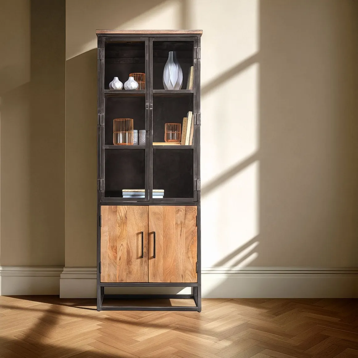 | Uitvoering | Uitgevoerd in mangohout natural met antique metalen frame, met 2 deuren en 2 glasdeuren. |