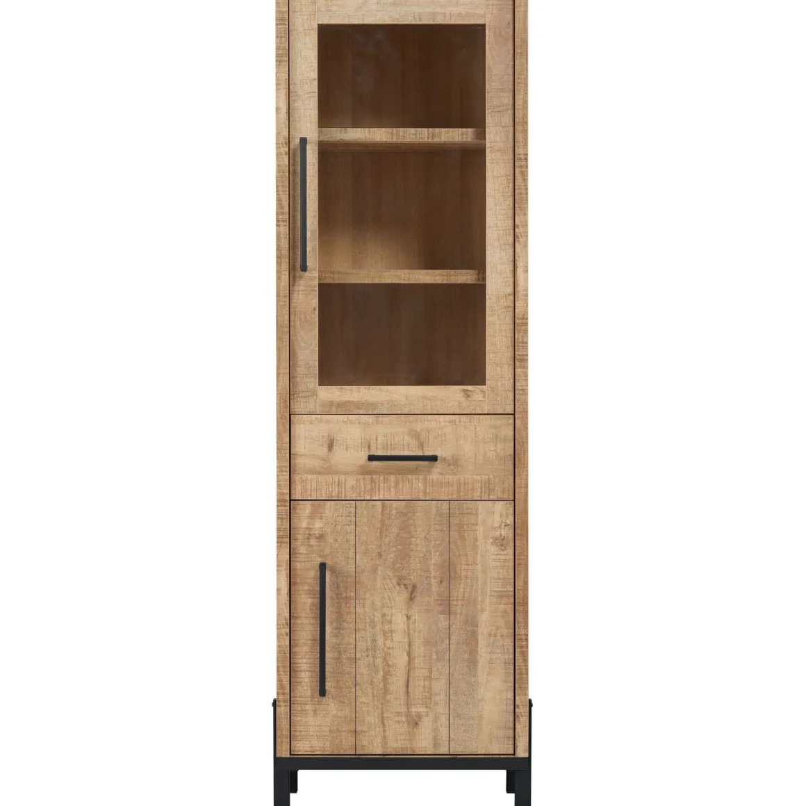 | Uitvoering | Uitgevoerd in melamine met mango decor in combinatie met zwart metalen frame, met 1 dichte deur, 1 glasdeur en 1 lade. | De deurtjes zijn zowel links- als rechtsdraaiend te monteren. |