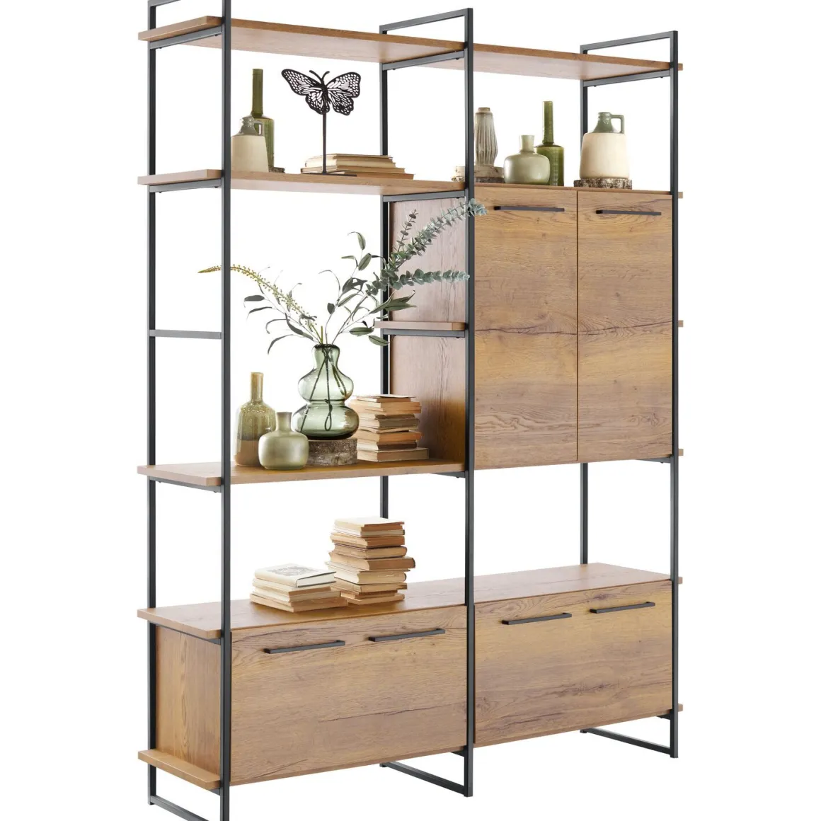 Deze kast combineert een strak zwart metalen frame met stijlvolle accenten in de kleur barley, een licht houtdecor met een zachte, natuurlijke uitstraling. De set bestaat uit drie zwarte metalen staanders, zes legplanken van 166 cm breed, een hoge inzetkast met twee deuren en twee inzetkasten met één lade. Afmeting: H226 x B166 x D45 cm. Je zet de kast eenvoudig zelf in elkaar. Alle onderdelen zitten overzichtelijk in één pakket met een duidelijke montagehandleiding. De inzetkasten zijn al voorgemonteerd.