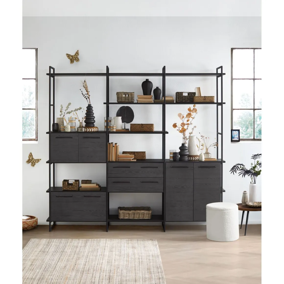 Deze kast combineert een strak zwart metalen frame met chique accenten in de kleur noir, een zwart houtdecor met een elegante en moderne uitstraling. De set bestaat uit vier zwarte metalen staanders, vier legplanken van 244 cm breed, twee legplanken van 166 cm breed en vier inzetkasten: één hoge inzetkast met twee deuren, één met één lade, één lage inzetkast met twee deuren en één met twee lades. Afmeting: H226 x B244 x D45 cm. Je zet de kast eenvoudig zelf in elkaar. Alle onderdelen zitten overzichtelijk in één pakket met een duidelijke montagehandleiding. De inzetkasten zijn al voorgemonteerd.