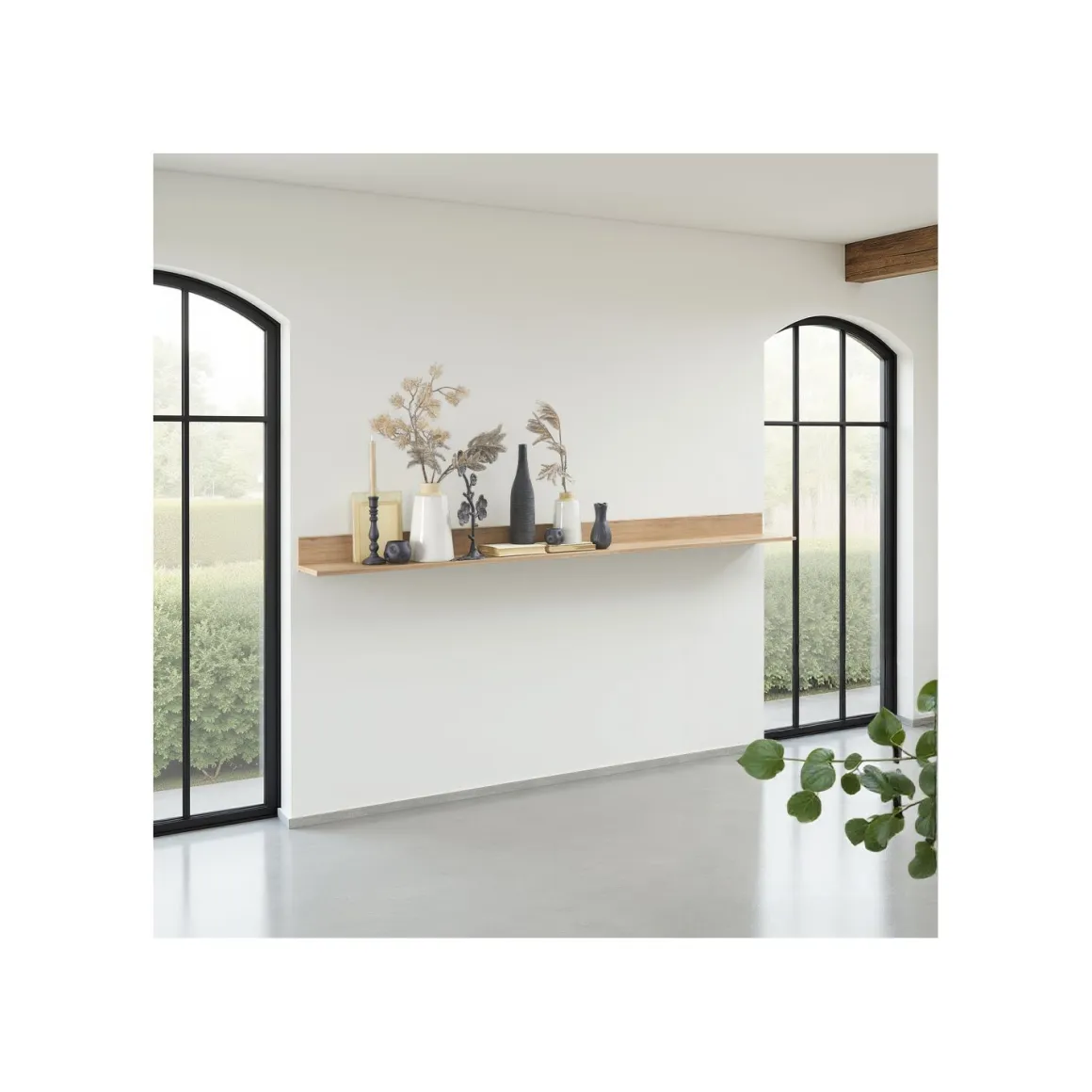 Met een breedte van 220 cm, hoogte van 12 cm en diepte van 21 cm is dit de grootste wandplank uit de Paranno-serie. Ideaal voor het presenteren van decoratieve items of als stijlvolle opbergruimte boven een dressoir of tv-meubel. De plank is eenvoudig te monteren en vormt een mooi geheel met de andere meubelen uit de serie.