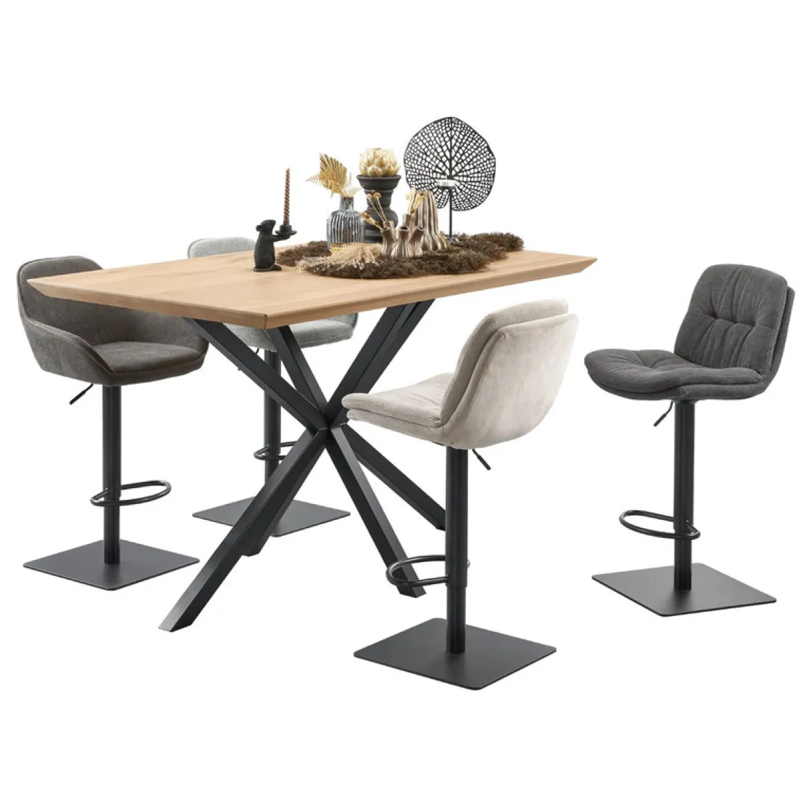 Deze uitvoering heeft een rechthoekig afgeschuind tafelblad van 160×90 cm in een lichte grijs-bruine kleur, en een zwart metalen spinpoot. De subtiele grijstint geeft de tafel een eigentijdse uitstraling, terwijl het eikenhout zorgt voor warmte en gezelligheid. De hoogte tot de onderkant van het blad is ca. 87 cm. Houd dit in de gaten als je barstoelen met armleuningen aan de tafel wilt zetten.