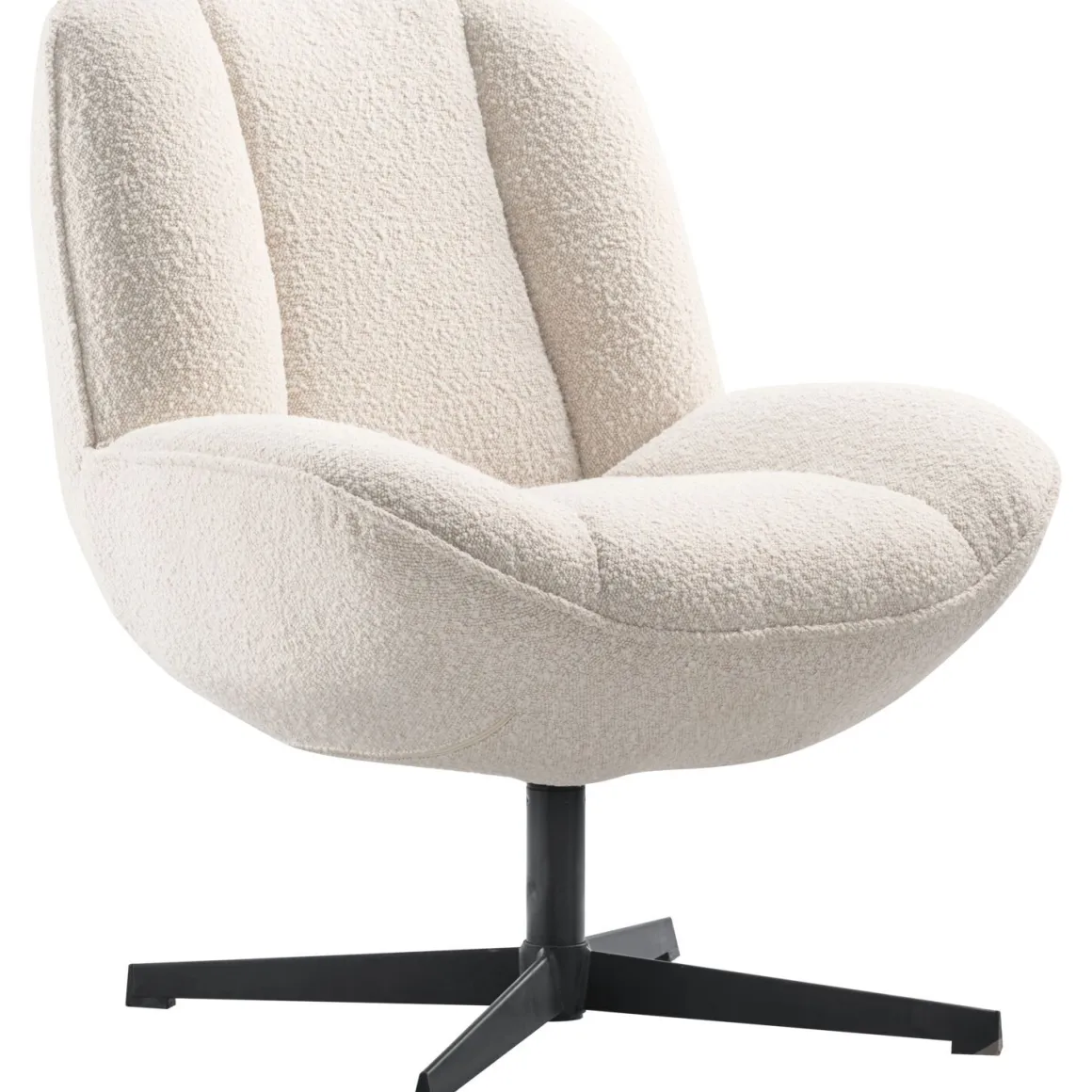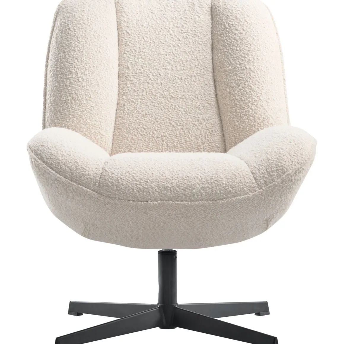 Fortenza is een compacte draaifauteuil met een ronde, vriendelijke vorm. De bouclé stof in ecru voelt zacht aan en geeft een knusse uitstraling. Het decoratieve stiksel zorgt voor een subtiele touch en maakt het ontwerp net even verfijnder. Door de ingetogen look past hij makkelijk in verschillende interieurs, zonder te veel op de voorgrond te treden.