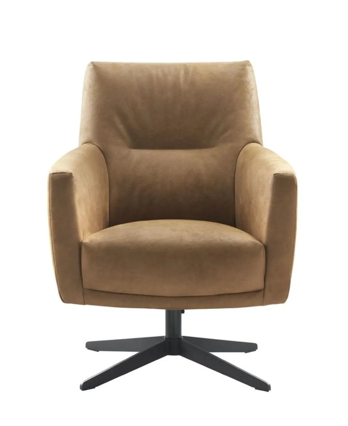 | Uitvoering | Uitgevoerd in microleder bull 09-camel met pocketvering met een toplaag van HR-koudschuim in de zitting, HR-koudschuim in de rug en een zwarte metalen 4-teens draaipoot, type KMF6. |