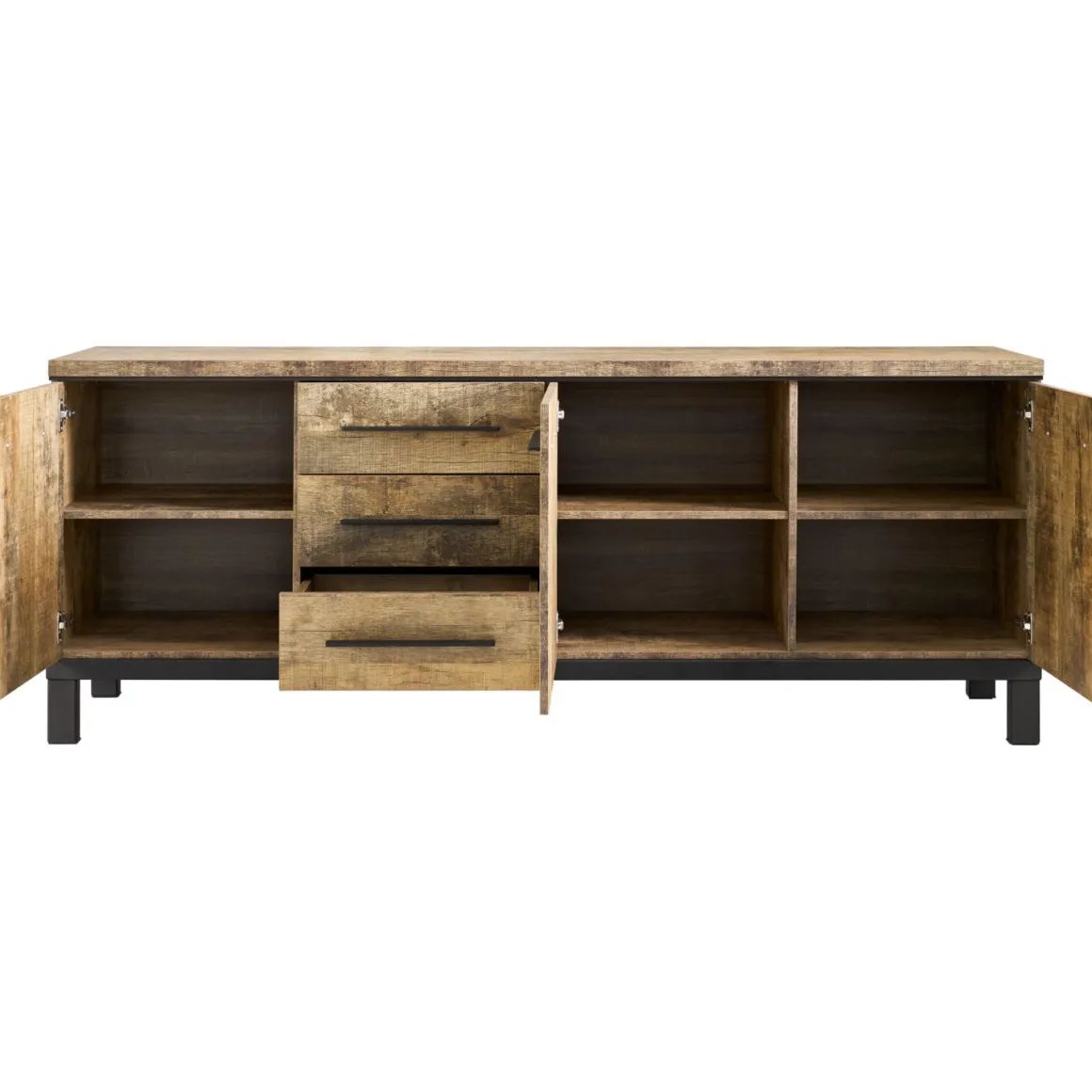 De combinatie van het zwart metalen frame en de kleur oriënt decor geeft het dressoir een robuust karakter. Het dressoir is uitgevoerd in Lamulux. Lamulux is een materiaalontwikkeling gebaseerd op houtvezelplaat en melamine en wordt bij onze meubelen gebruikt als toplaag. Het is sterk, hard en minder gevoelig voor krassen. Door de aangebrachte houttekening en -structuur, heeft het dezelfde karakteristieke kenmerken van massief hout. Het ziet er niet alleen uit als echt hout, het voelt ook nog eens zo!