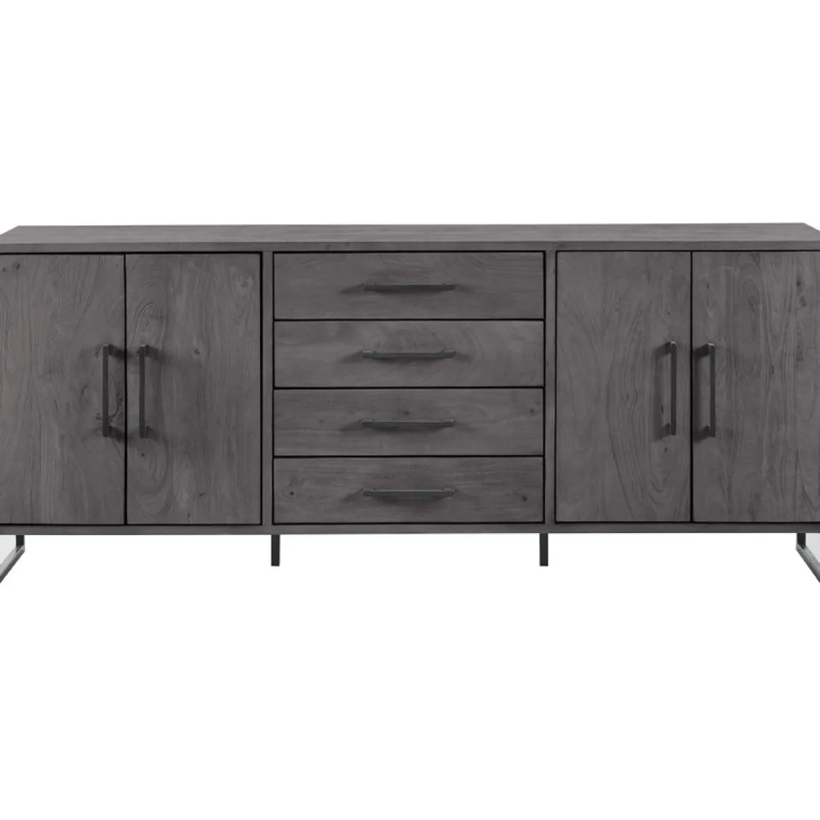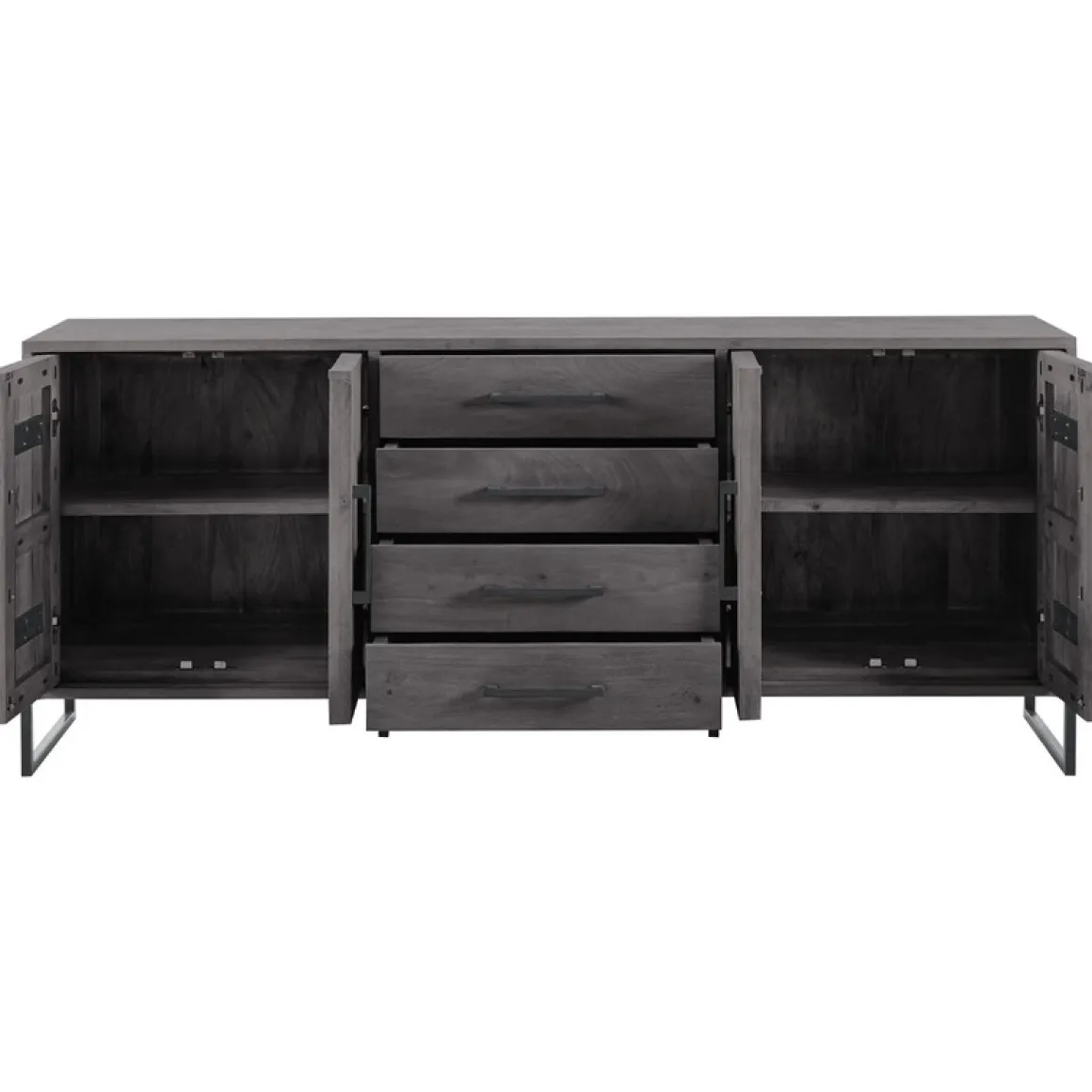 | Uitvoering | Uitgevoerd in gezandstraald mangohout in de kleur deep black en een zwart metalen frame, met 4 deuren en 4 laden. |