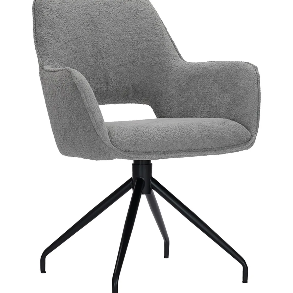 De kuip is vormgegeven met een prettige ronding, waardoor je comfortabel zit tijdens lange etentjes. De armleuningen hebben een hoogte van 66 cm, waardoor ze perfect onder de meeste standaard eettafels passen. Voor een optimaal gebruik raden we aan om rekening te houden met een speling van 2 tot 2,5 cm tussen de armleuning en de onderkant van het tafelblad. De stoel staat op een stevige zwarte kruispoot, die niet alleen zorgt voor een moderne uitstraling maar ook is uitgerust met een 360-graden draaifunctie voor extra gebruiksgemak. De montage is eenvoudig zelf te doen met behulp van de bijgeleverde instructies.
