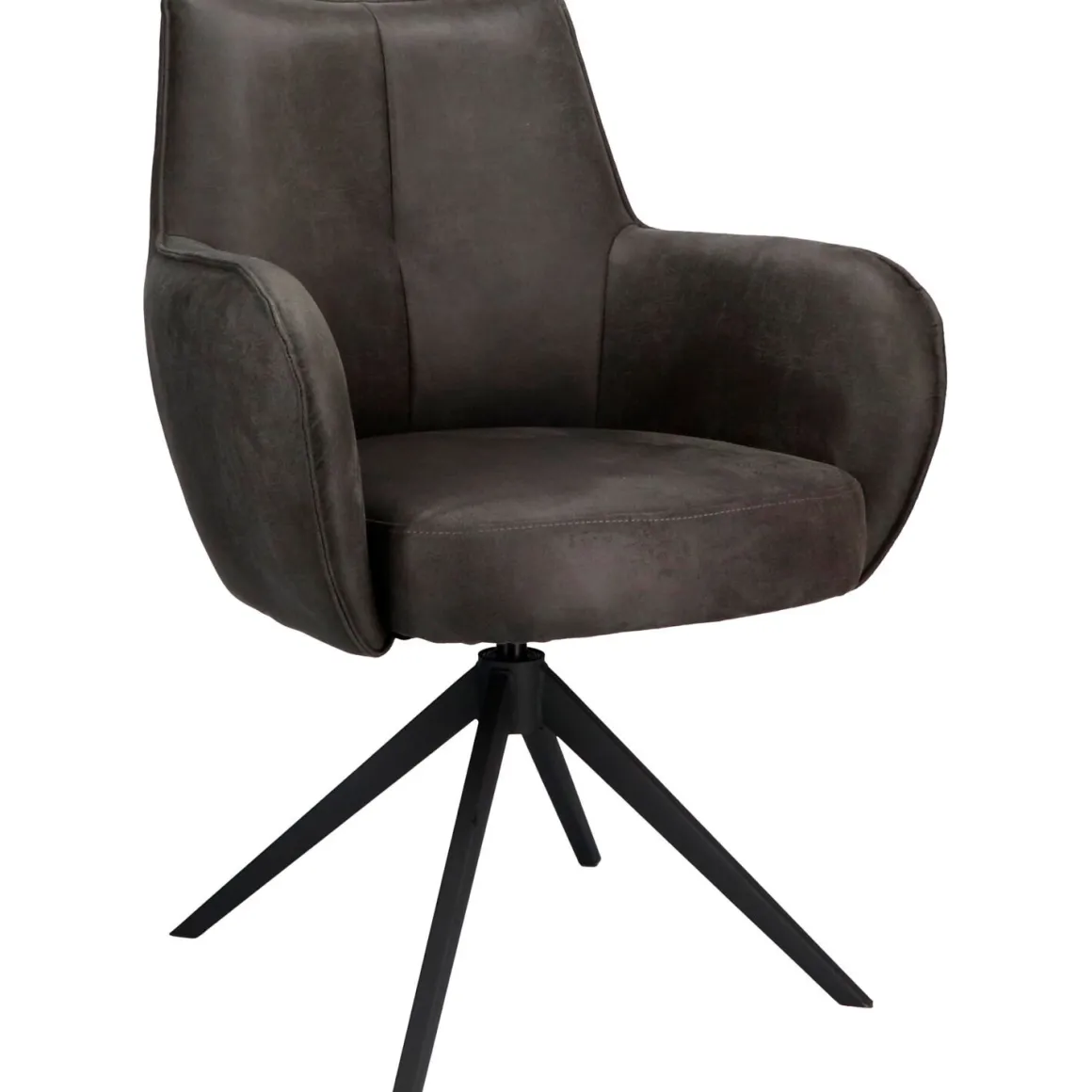 De armstoel Dordona is een comfortabele en moderne toevoeging aan de eetkamer. De stoel is uitgevoerd in een zachte microlederstof in een diepe antraciettint. Deze stof voelt fluweelzacht aan, heeft een luxe uitstraling en is tegelijkertijd slijtvast en onderhoudsvriendelijk. De afgeronde armleuningen en de zwarte metalen draaipoot geven de Dordona een eigentijdse look. Dankzij de prettig gevormde kuip en de vaste kussens in rug en zitting biedt de stoel optimaal zitcomfort, ook tijdens lange avonden aan tafel.