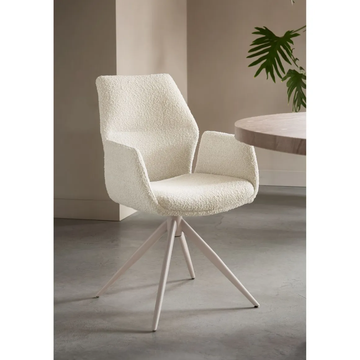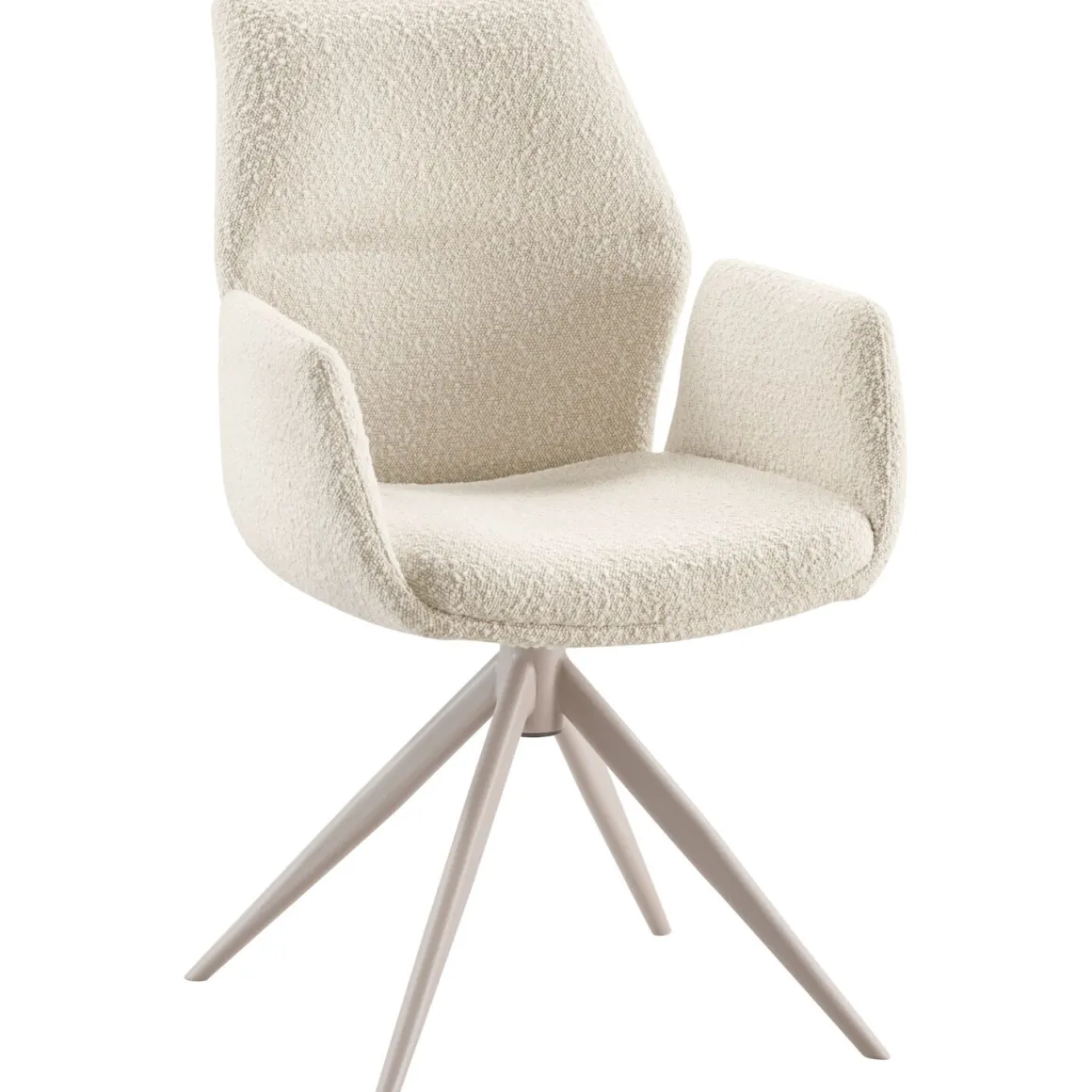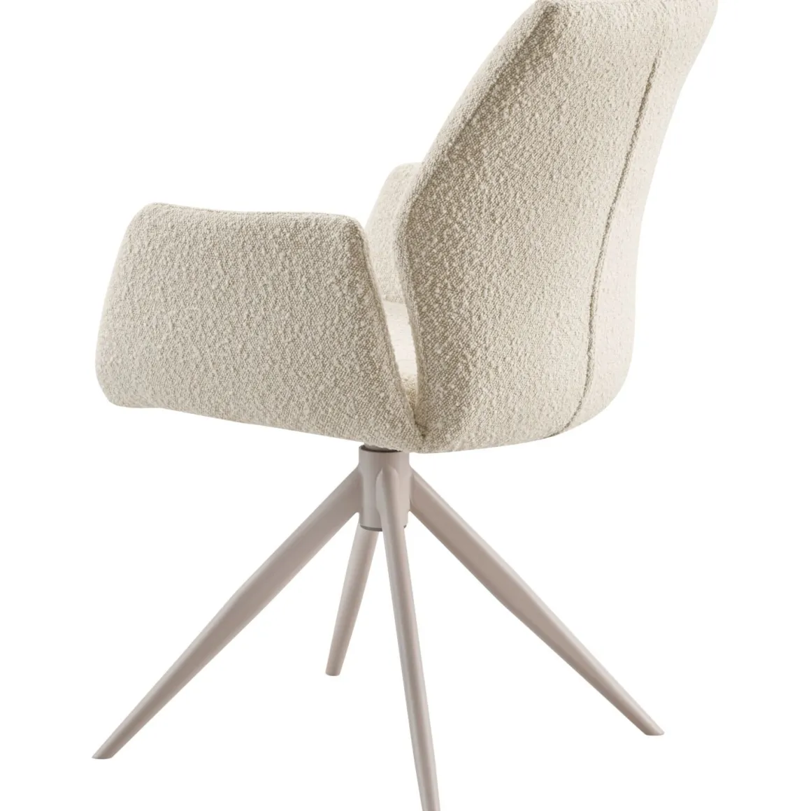 Eetkamerstoel met armleuning in ecrukleurige bouclé stof en taupegrijze metalen poten