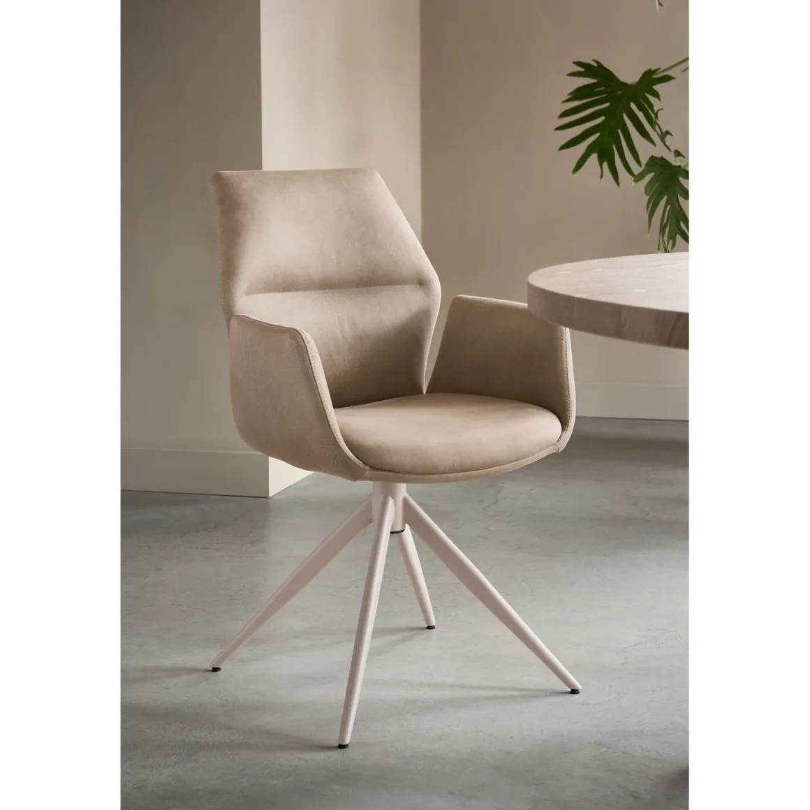 Eetkamerstoel met armleuning in microvezel taupe met poten in taupegrijze kleur