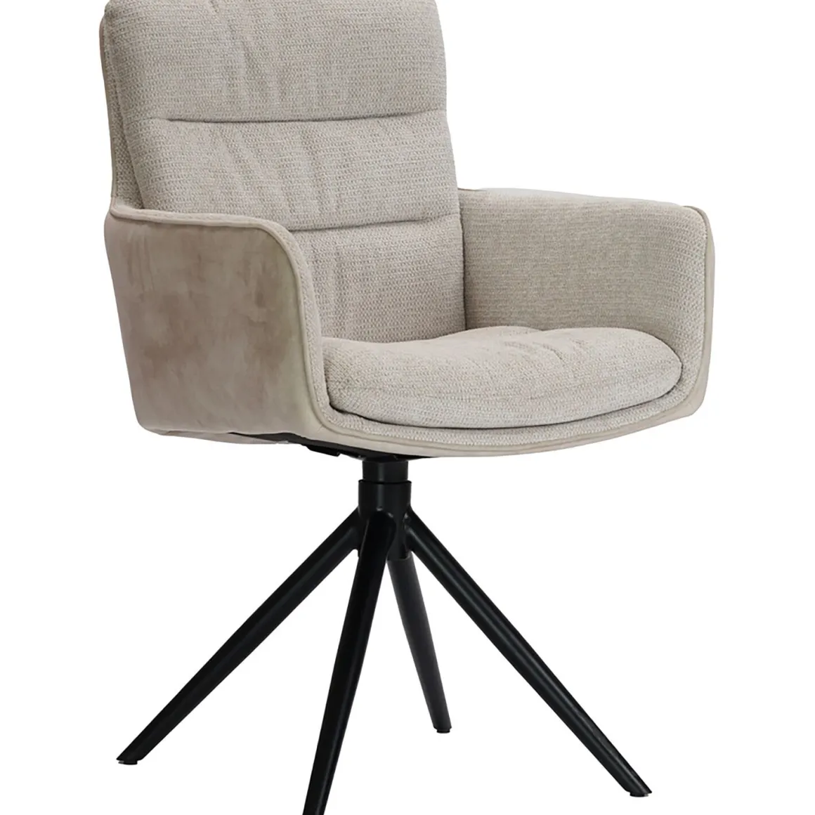 De buitenzijde van armstoel Letta is bekleed met een zachte velvetstof. Door de lichtinval op de vezels ontstaat een speels en luxueus kleureffect. De binnenzijde is uitgevoerd in een meerkleurige weefstof met een subtiele, zachte structuur. Samen zorgen deze stoffen, in warme beigetinten, voor een rustige en uitnodigende uitstraling. De zwart metalen poot voegt daar een modern accent aan toe.