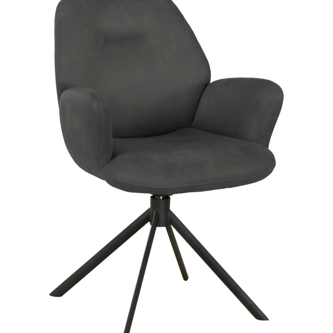 Armstoel Loranzo is uitgevoerd met een zachte microvezelstof in een stijlvolle donkergrijze tint. De stof voelt comfortabel aan, is slijtvast en makkelijk te onderhouden. Een subtiel sierstiksel in de rugleuning en de zwarte metalen draaipoot geven de stoel een moderne, elegante uitstraling. Dankzij de volledig gestoffeerde afwerking past Loranzo perfect in elk interieur.
