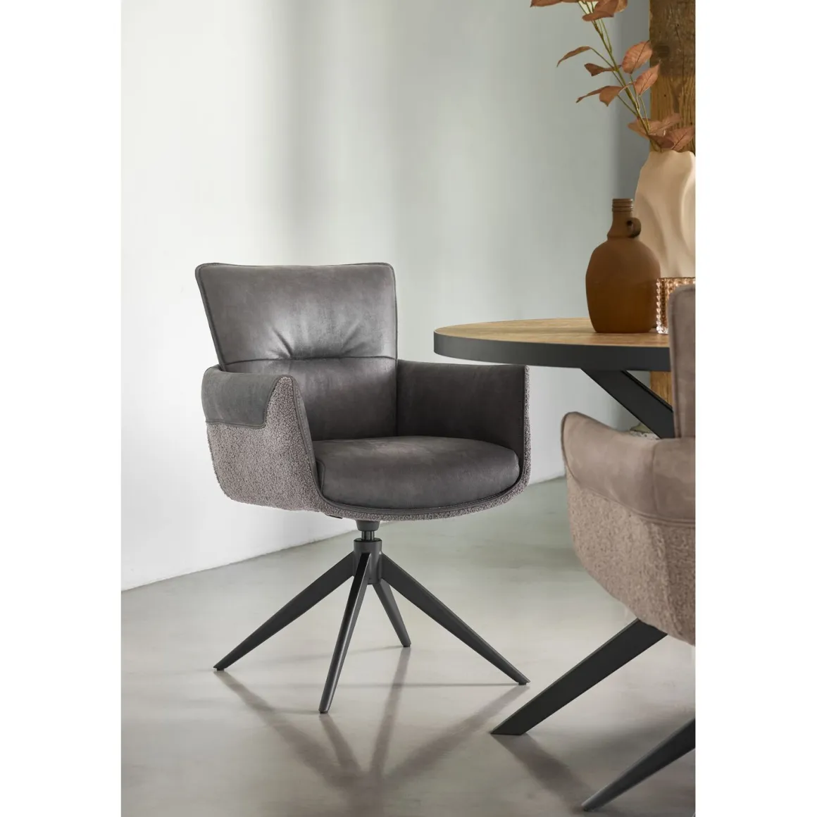 | Uitvoering | Uitgevoerd in microleder bull 67-antracite (binnenzijde + deels buitenzijde kuip) en stof teddy-459 (onderste rand buitenzijde kuip) met metalen kruispoot in de kleur 62-antraciet, met terugdraaifunctie. |