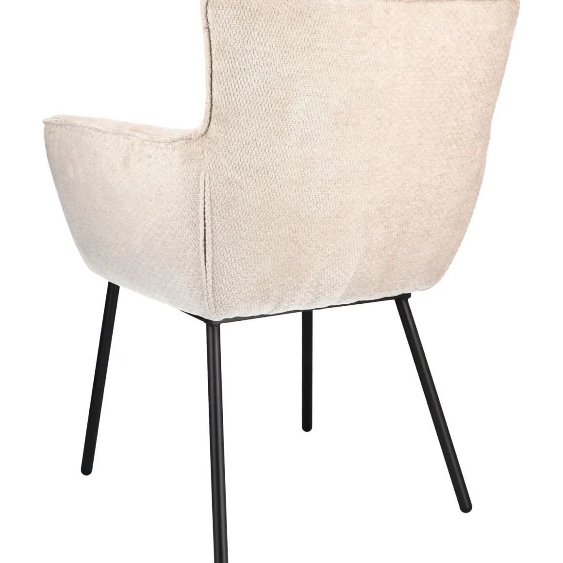 De kuipvorm van de zitting zorgt voor een comfortabele en stevige zit. De armleuning heeft een hoogte van 67 cm, waardoor de stoel onder de meeste standaard eettafels past. De rugleuning is voorzien van een elegant blokstiksel, wat een subtiel designelement toevoegt. De stoel is maximaal belastbaar tot 125 kg en de metalen poten moeten zelf worden gemonteerd; met de bijgeleverde handleiding is dat eenvoudig te doen.