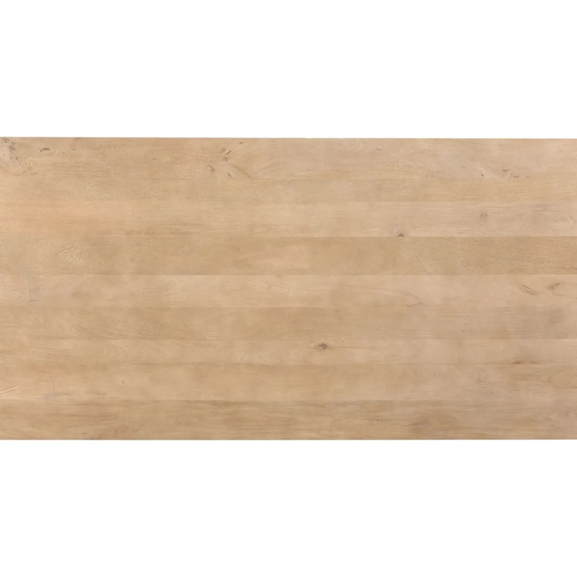 | Uitvoering | Uitgevoerd met een rechthoekig blad (3 cm dik) in gezandstraald mangohout in de kleur warm naturel met een afgeschuinde bladrand en een zwarte metalen spinpoot. |