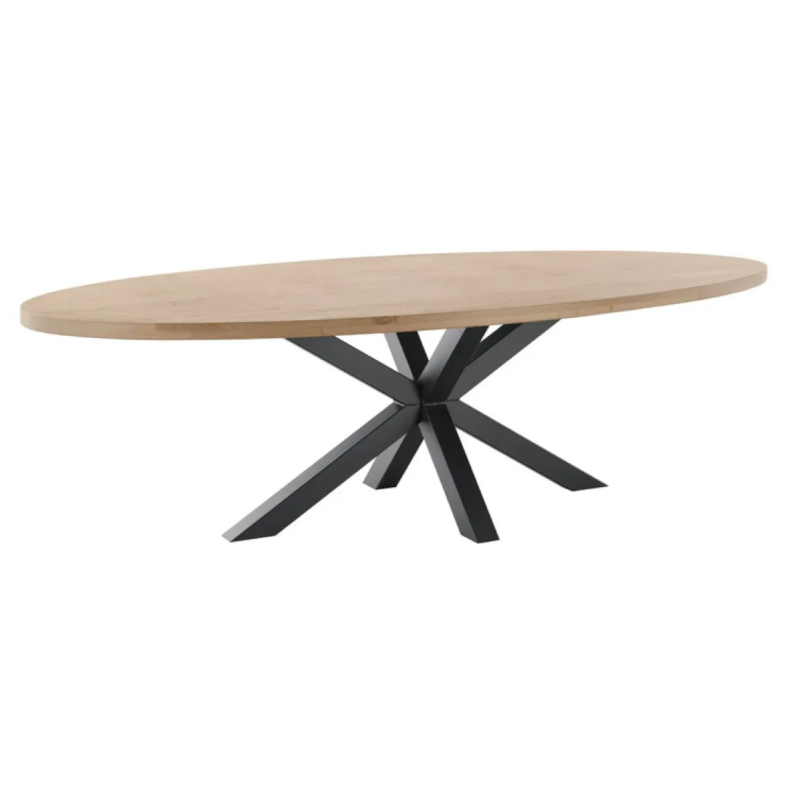 Deze uitvoering heeft een ovaal vlak tafelblad van 260×125 cm in een lichte grijs-bruine kleur, en een zwart metalen spinpoot. De hoogte tot de onderkant van het blad is ca. 71 cm. Houd dit in de gaten als je stoelen met armleuningen aan de tafel wilt zetten.