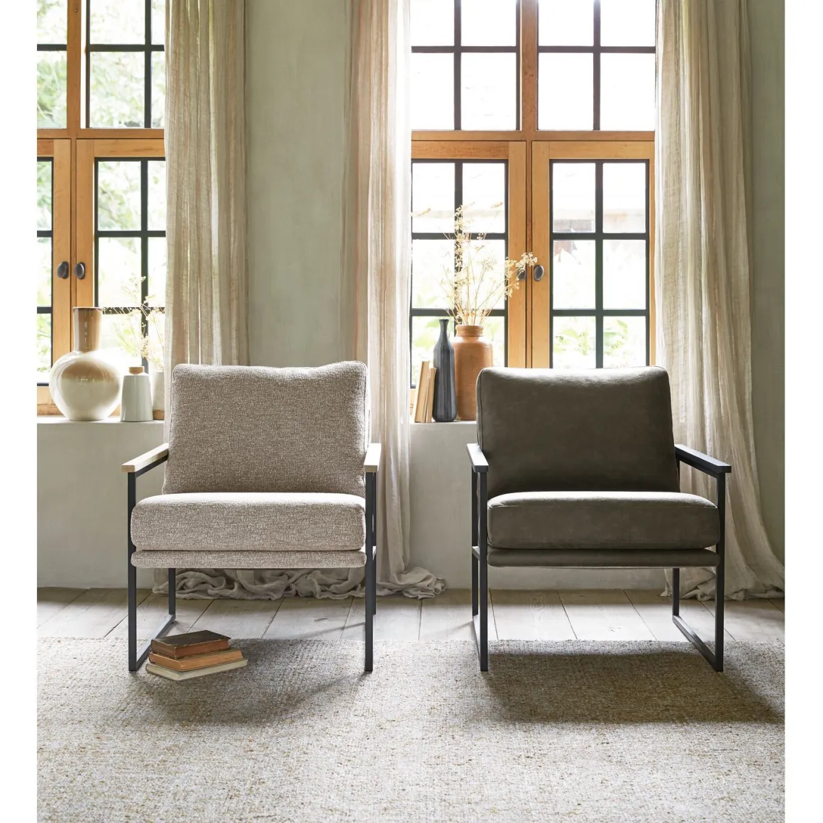 Fauteuil Claut brengt moderne eenvoud samen met warme details, passend bij een Scandinavisch geïnspireerd design. De slanke vormgeving en open armleuningen zorgen voor een luchtig, eigentijds silhouet. De metalen armleuningen zijn afgewerkt met een zwart gelakt houten legger, een stijlvol detail dat ook prettig aanvoelt voor je arm. De bekleding in een beige kleur met grijze ondertoon is uitgevoerd in een fijne weefstof met subtiele kleurnuances en een rustige structuur, die comfortabel aanvoelt en geschikt is voor dagelijks gebruik.