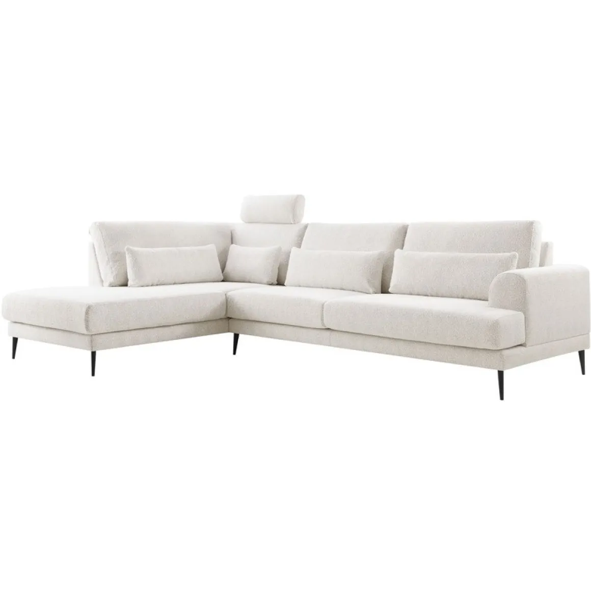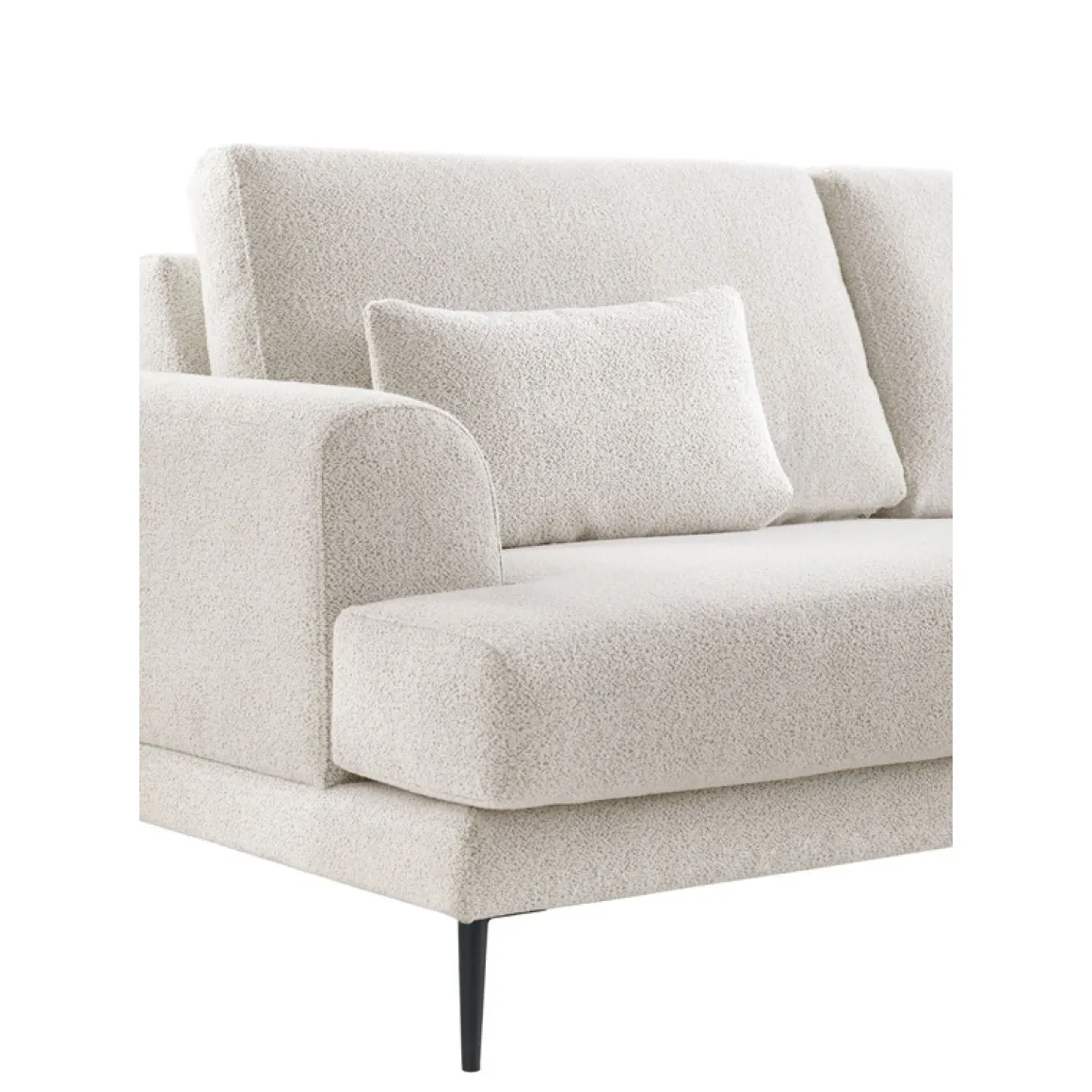 Hoekbank Ansio kenmerkt zich door zijn eigentijdse uitstraling. Hierdoor past het model in vrijwel ieder interieur. De hoekbank is bekleed met een beige bouclé stof. Deze stof bestaat uit los geweven patronen, draden en lussen. Ondanks de onregelmatige structuur die hierdoor ontstaat, voelt de stof lekker zacht en warm aan. De bank heeft een wat diepere zit maar door de bijgeleverde lendenkussens kun je heerlijk zitten ook als je wat minder lang bent, dus uitermate geschikt voor zowel lange als minder lange mensen. Ook zorgen de lendekussens voor een heerlijk comfort en in combinatie met de afgeronde arm en zwarte metalen poten geeft dit de bank een moderne en luxe uitstraling.