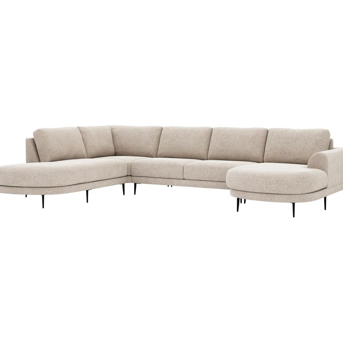 | Uitvoering | 1 zits met eiland rond links + hoekelement + 2,5 zits zonder armen + chaise longue rond arm rechts uitgevoerd in stof macan 102-ecru met een toplaag van traagschuim in de zitting, HR-koudschuim met een afdeklaag van siliconenvlokken en donsveren in de rug en zwarte metalen poten, type M-14 (15 cm). |