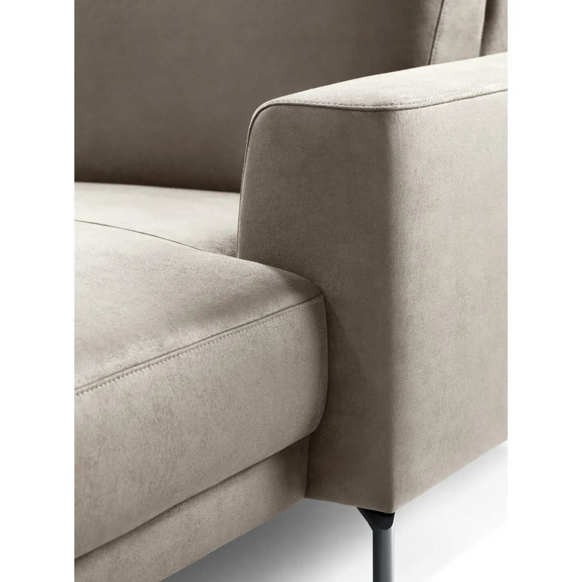 De grijze hoekbank Moscato is bekleed met microleder, een duurzaam en onderhoudsvriendelijk materiaal dat bestaat uit een combinatie van een onderlaag van leervezels en een bovenlaag van microvezelstof met een geschuurd effect. Dit maakt de stof niet alleen zacht en comfortabel, maar ook bestand tegen slijtage en gemakkelijk te reinigen. Het biedt de uitstraling van echt leer, maar met de voordelen van een lichtere, betaalbare en milieuvriendelijkere optie.