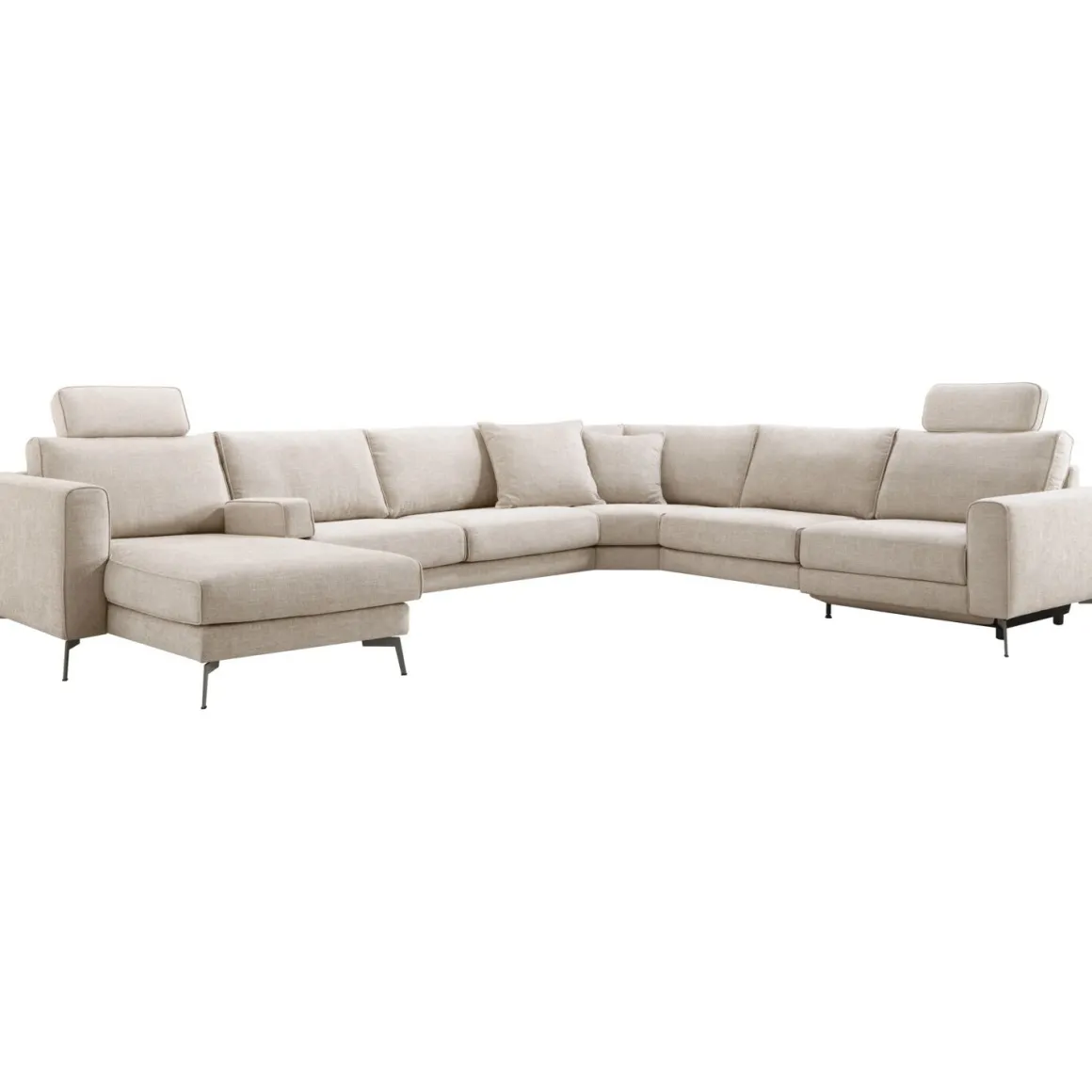 | Uitvoering | Longchair arm B2 links + 2 zits zonder armen + trapezehoek + 1 zits (80) zonder armen + 1 zits (80) arm B1 rechts met 2-motorige relaxfunctie en verstelbare hoofdsteun B 60 met vlindernaad, uitgevoerd in stof miami 01-natural met 2 lagen HR-koudschuim in de zitting, siliconenvlokken in de rug en grijze metalen poten, type MF1 (7039 grau, hoogte 15 cm). |