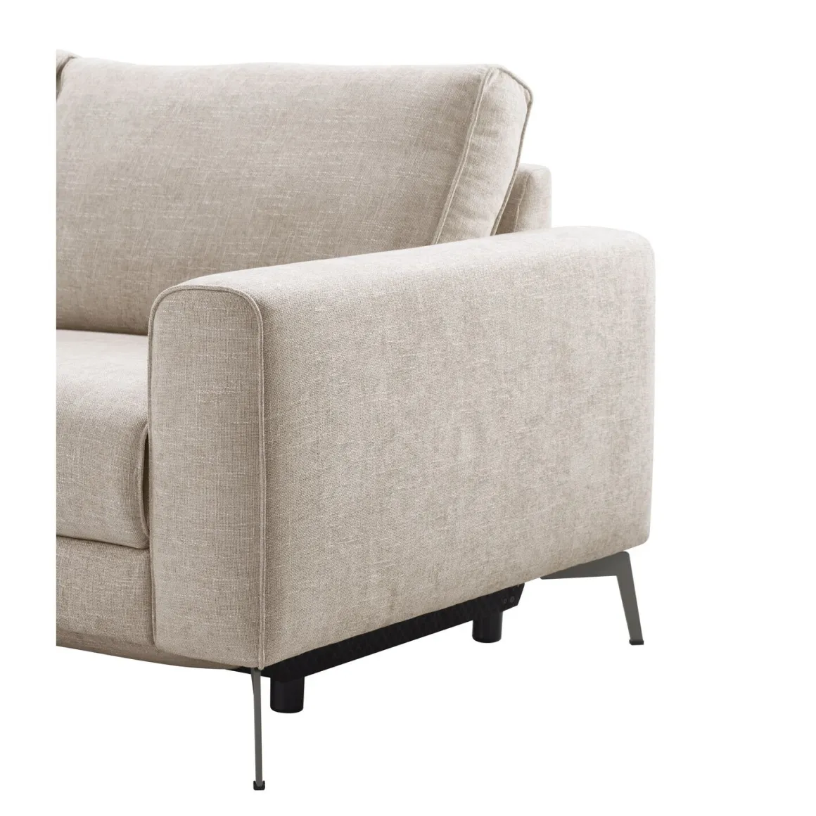 Hoekbank Linoza heeft een moderne en luxueuze uitstraling dankzij de royale vorm en de karakteristieke vlindernaad. De bank is uitgevoerd in een beige-grijze weefstof met verschillende kleurnuances en een subtiele glans, wat zorgt voor een warme en levendige uitstraling. De zachte structuur van de stof draagt bij aan het comfortabele karakter van de bank. De donkergrijze metalen poten geven het geheel een eigentijdse en stijlvolle look.