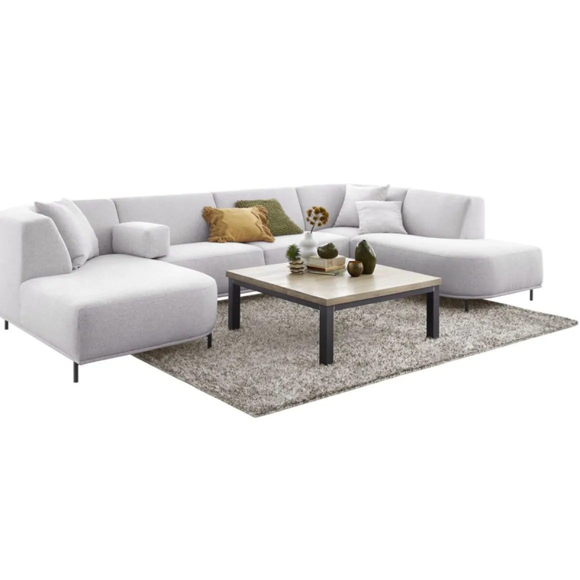| Uitvoering | Longchair rond links + 3 zits zonder armen + hoek met eiland rond rechts in stof leaf 40-ashgrey met HR-koudschuim in de zitting en 2 lagen HR-koudschuim in de rug en zwarte metalen poten, type MF1 (12 cm). |