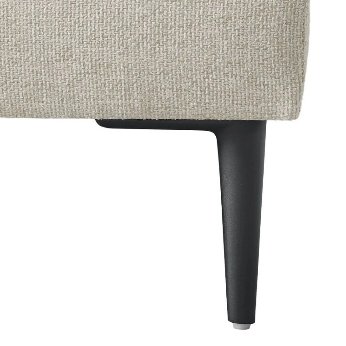 | Uitvoering | Hoek met eiland groot links + 2,5 zits zonder armen + chaise longue arm rechts in stof rate 01-natural met HR-koudschuim in de zitting, HR-koudschuim met een afdeklaag van polyetherschuim- en siliconenvlokken in de rug en zwarte metalen poten, type M-14 (13 cm). |