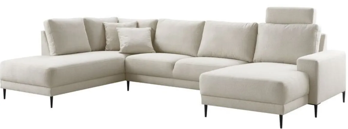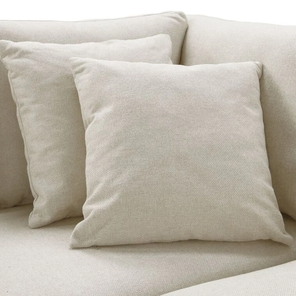 Hoekbank Portona heeft een luxe, comfortabele uitstraling door de volle rug- en zitkussens. De royale hoekbank is uitgevoerd in een trendy ecru kleurige stof. De stof is een fijne gemĂȘleerde weefstof, die lekker zacht aanvoelt.