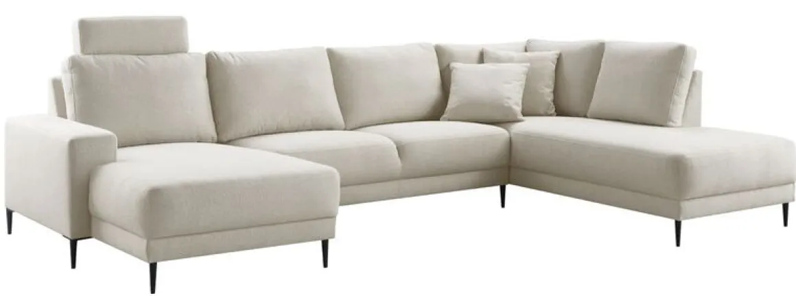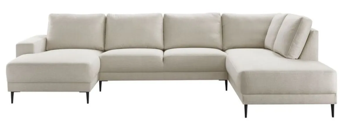 | Uitvoering | Longchair arm links + 2,5 zits zonder armen + hoek met eiland groot rechts in stof rate 01-naturel met HR-koudschuim in de zitting, HR-koudschuim met een afdeklaag van polyetherschuim- en siliconenvlokken in de rug en zwarte metalen poten, type M-14 (13 cm). |