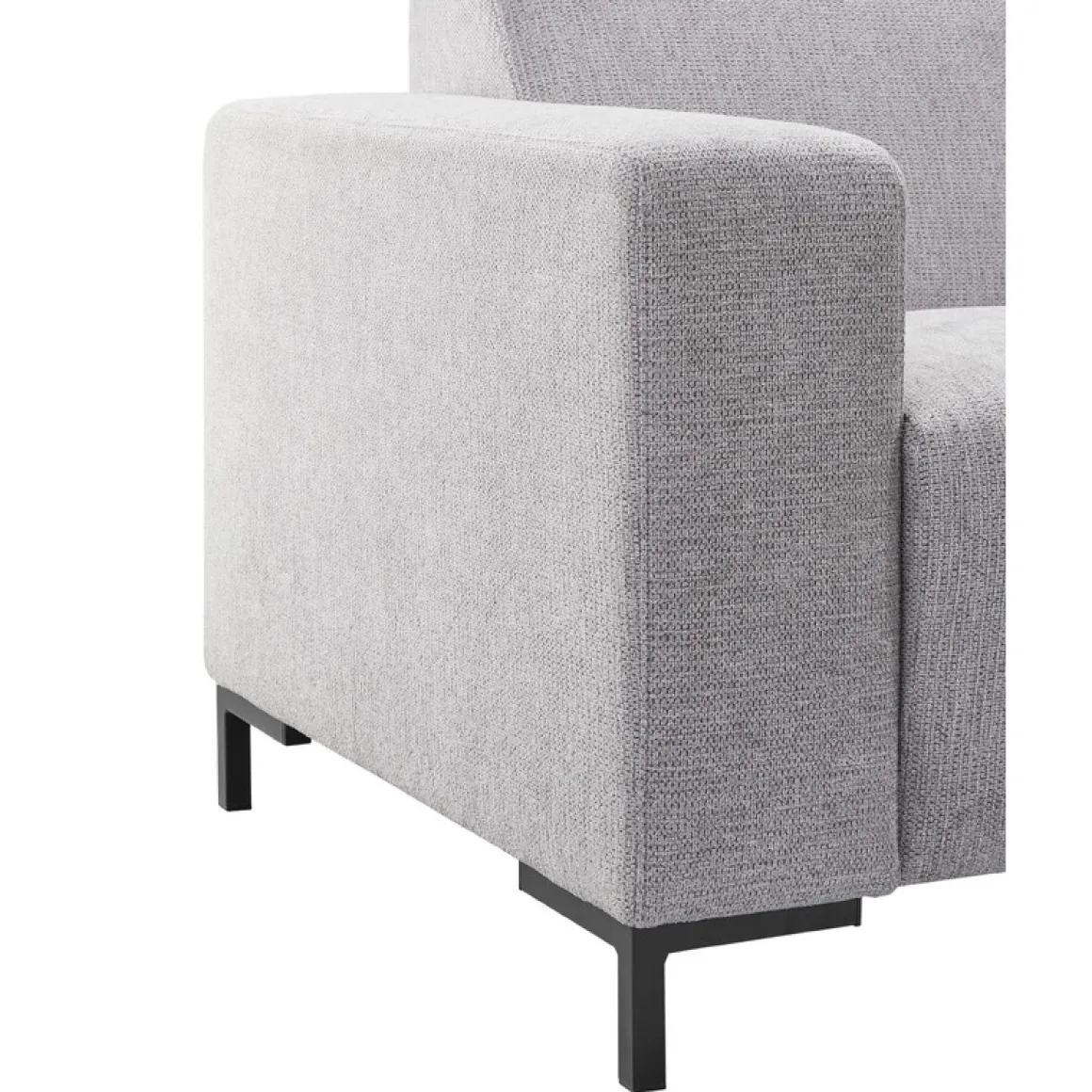De bank is bekleed met een grijze gemĂȘleerde weefstof. Deze licht meerkleurige kwaliteit heeft een wat grovere structuur, maar wel een erg zachte touch. De zwart metalen poten maken deze moderne bank helemaal af.