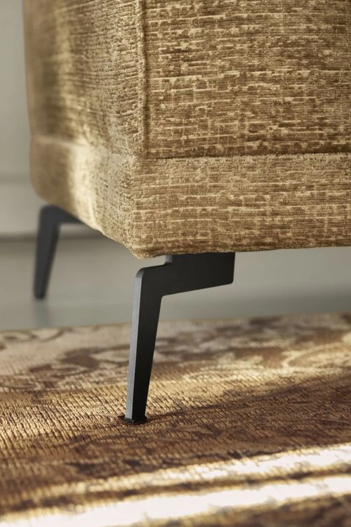 Met deze hoekbank haal je een echte eyecatcher in huis! De stof waarmee deze bank bekleed is, is van hoge kwaliteit en voelt heerlijk zacht aan. Er zit een licht 3D effect in, wat zorgt voor een volumineuze en luxe uitstraling. De kleur laat zich het beste omschrijven als bruin, maar neigt naar het groen en heeft een gouden nuance. De strakke lijnen van dit model worden geaccentueerd door de zwart metalen designpoten en de gesloten vlindernaad waarmee de armleuningen en kussens zijn afgewerkt. Zie jij deze bank al bij jou thuis staan schitteren?
