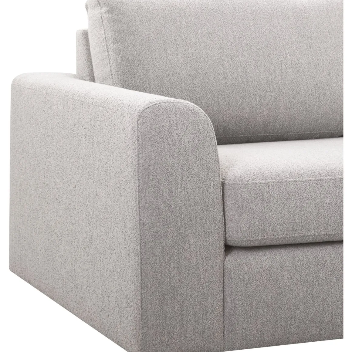 De hoekbank Arnad valt direct op door zijn afgeronde vormen en een landelijke twist. De bank is bekleed met de grijs gemêleerde boucléstof Alpine, die bestaat uit los geweven patronen, draden en lussen, wat zorgt voor een speels, onregelmatig effect. Ondanks de structuur voelt de stof zacht aan. De bank staat op lage, zwarte kunststof pootjes die discreet onder het ontwerp verdwijnen.