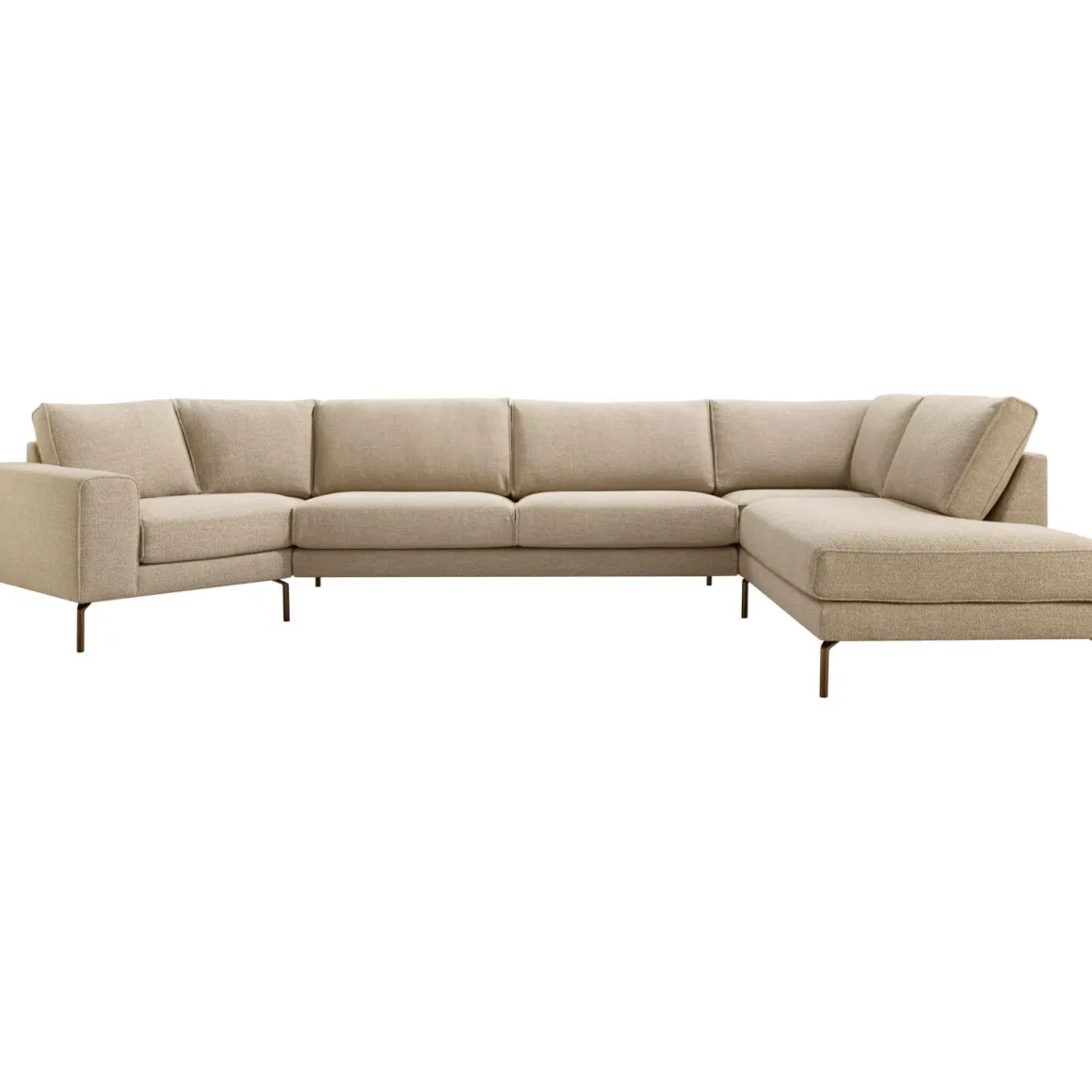 Hoekbank Linoza heeft een moderne, tijdloze uitstraling door de royale vormen en de losse zit- en rugkussens. De bank is uitgevoerd in een weefstof in een warme natureltint met een subtiele structuur, die zacht aanvoelt en zorgt voor een natuurlijke en sfeervolle uitstraling. De metalen poten in een warme bruintint geven de bank een stijlvol en eigentijds accent.
