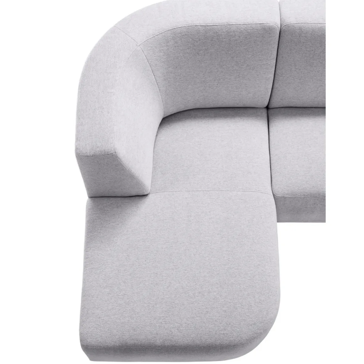 Hoekbank Pantini heeft een moderne en vriendelijke uitstraling door de ronde vormen en de dunne plint die subtiel aansluit op de volle zit- en rugleuning. De bank is uitgevoerd in een lichtgrijze gemĂȘleerde weefstof. Door het gebruik van verschillende garens ontstaat een levendig, licht meerkleurig effect met een structuur die zacht en vol aanvoelt. De zwarte metalen poten geven de bank een strak en eigentijds accent.