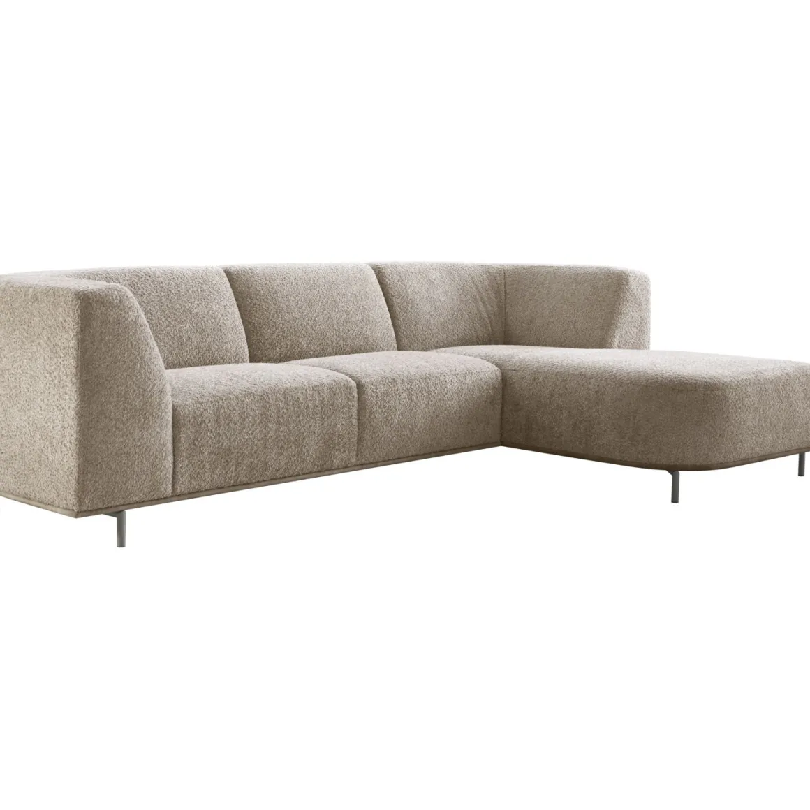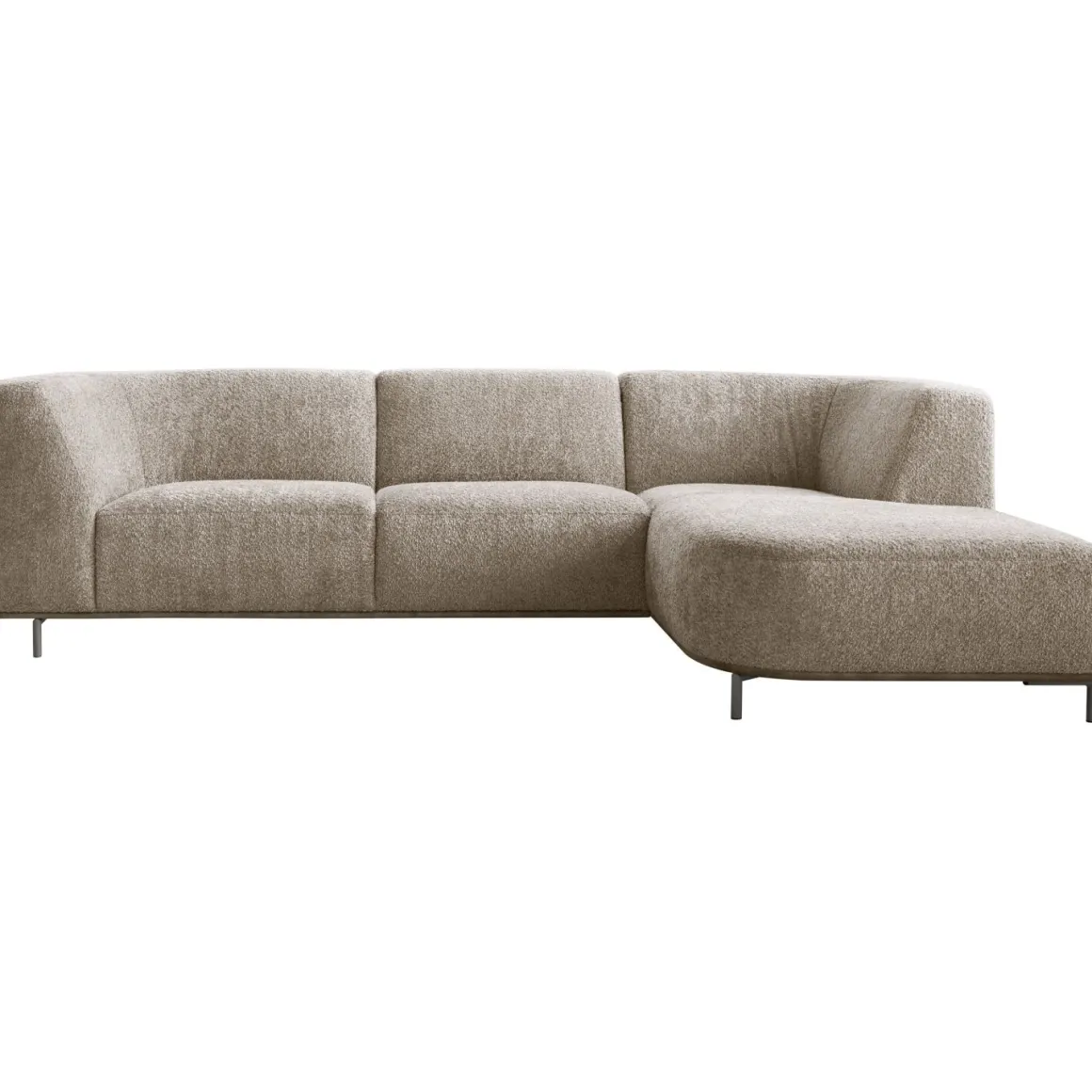 Deze hoekbank is een echte eyecatcher: zacht in vorm, hip in uitstraling en helemaal van nu. Door de rond doorlopende zitting en rug krijgt het ontwerp een zachte, vloeiende vorm die volledig aansluit bij de huidige woontrends. De bank is bekleed met een gemêleerde weefstof in een grijs-taupe tint. Door de combinatie van verschillende garens ontstaat een subtiele glans, waardoor de kleur afhankelijk van de lichtinval warmer of juist wat grijzer kan ogen. De plint is uitgevoerd in een velvet stof in een beige-grijze tint, wat een luxe en stijlvol contrast vormt. De donkergrijze metalen poten voegen een verfijnd designaccent toe.