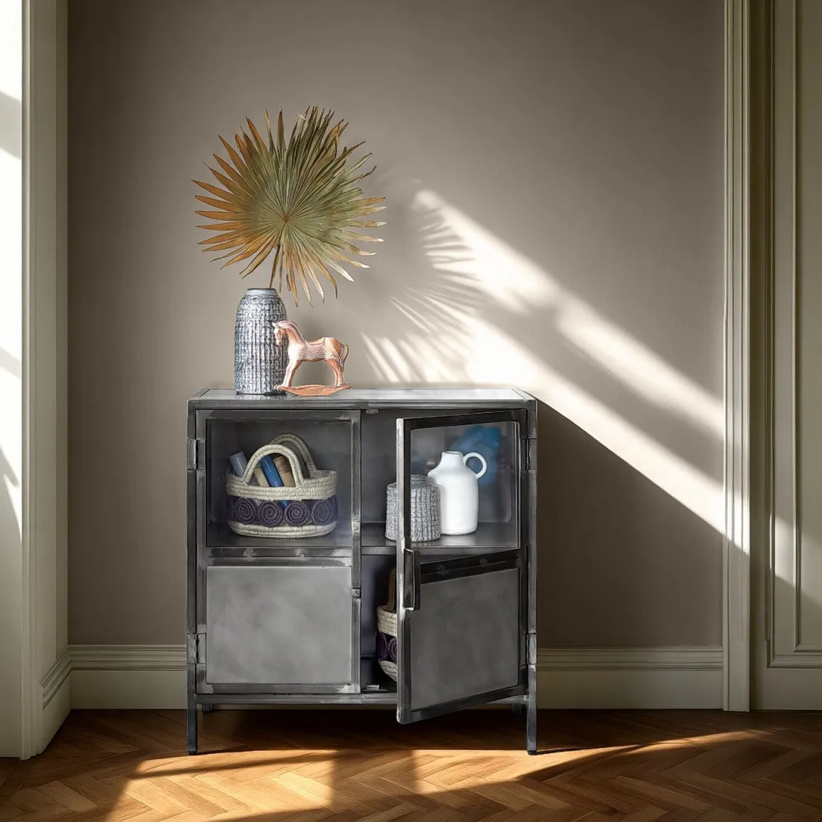 Industrieel opbergkastje met metaal en glas