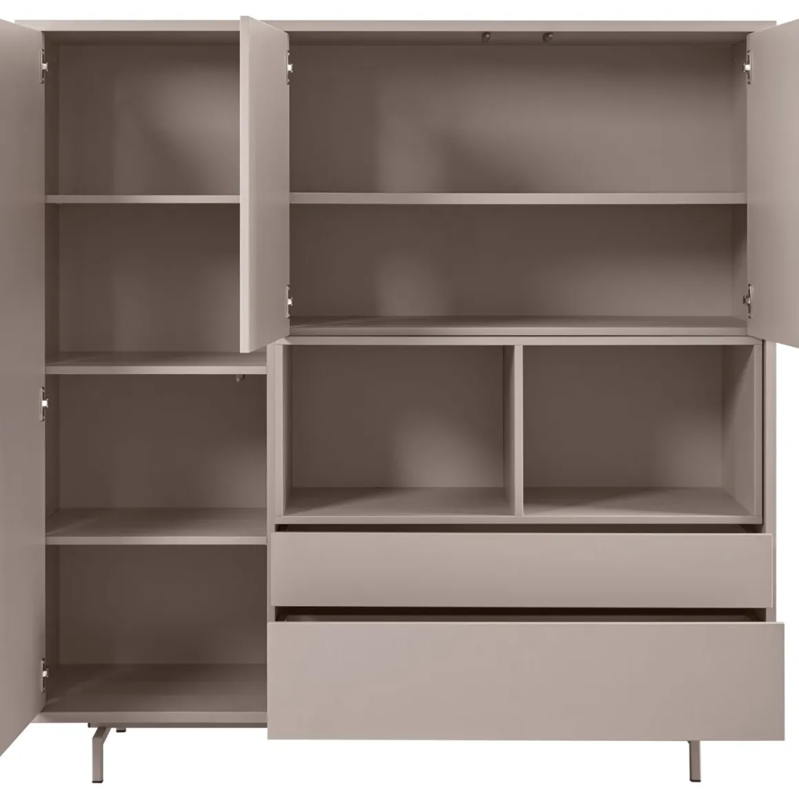 | Uitvoering | Uitgevoerd in melamine met stone grey decor met 3 deuren, 2 laden en 2 open vakken en metalen poten in kleur stone grey. |